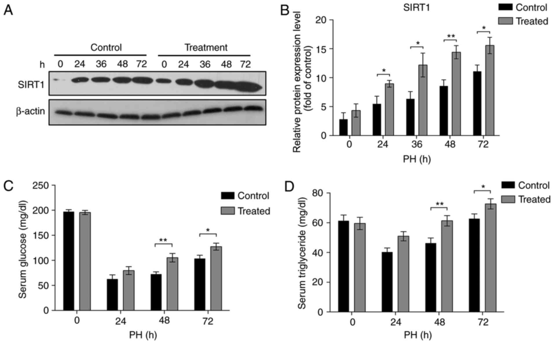 In the present study, male C57BL/6 mice (6–8 weeks old; 15–20 g; n=30, 6 per group; Beijing HFK Bioscience Co., Ltd., Beijing, China) were raised in specific pathogen-free conditions (23±1°C; relative humidity, 39–43%; 12 h light/dark cycle; free access to food and water). Animal care and experimental protocols were conducted in accordance with guidelines provided by the Institutional Animal Care and Use Committee of Sichuan University (Chengdu, China). Ethics approval was obtained from the Institutional Ethics Committee of Sichuan University. Prior to subjecting the mice to 70% PH, mice were anesthetized with a subcutaneous injection of pentobarbital at a dose of 80 mg/kg. For the study group, Nam (250 mg/kg per day) was administered 6 h prior to PH via intraperitoneal injection and once daily subsequently for a total of 3 days. Control animals were treated with the same frequency and volume of PBS as Nam. All of the study mice were sacrificed at the indicated time points (24, 36, 48 and 72 h) and the liver samples were harvested and stored in liquid nitrogen. Liver recovery rates were calculated as the ratio of the regenerating liver weight to the mean liver weight prior to PH. The serum samples (1 ml) were additionally collected from the angular veins of the mice. Blood glucose (Glu), triglyceride (TG), aspartate aminotransferase (AST) and alanine aminotransferase (ALT) were measured using enzymatic methods (ADVIA 165; Siemens Healthineers, Erlangen, Germany).