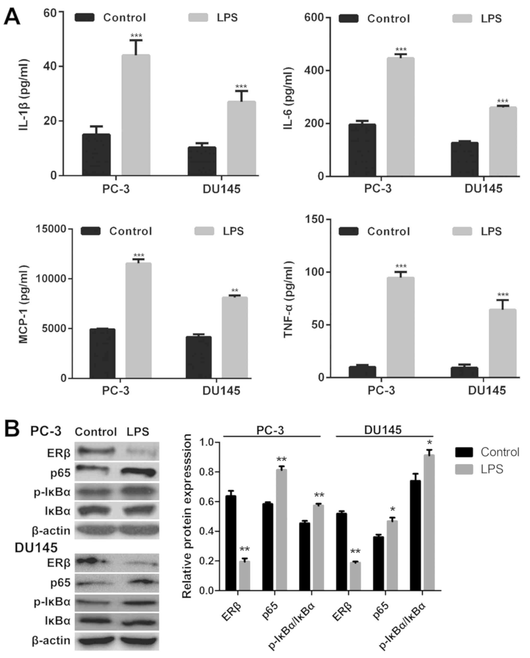 To investigate whether p65 is regulated by ERβ signaling, the expression levels of proteins involved in the NF-κB pathway were determined. As presented in Fig. 1B, increased p65 and p-IκBα expression, and decreased ERβ expression were observed in LPS-stimulated PC-3 and DU145 cells compared with the controls; however, no significant differences were reported for total IκBα expression.