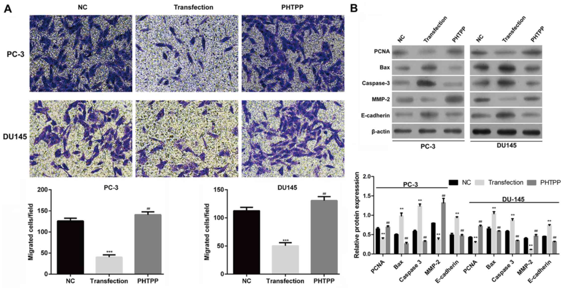 As ERβ signaling appeared to be involved in the regulation of cell viability, apoptosis and migration, and the expression of proteins associated with these properties was determined. PCNA, Bax and caspase-3, and MMP-2 and E-cadherin were selected as markers of proliferation (17), apoptosis (18) and epithelial-mesenchymal transition-associated migration (19), respectively. As presented in Fig. 4B, overexpression of ERβ suppressed the expression of PCNA and MMP-2, but promoted the expression of Bax, caspase-3 and E-cadherin in PC-3 and DU145 cells. These alterations in expression were reversed by treatment with PHTPP.