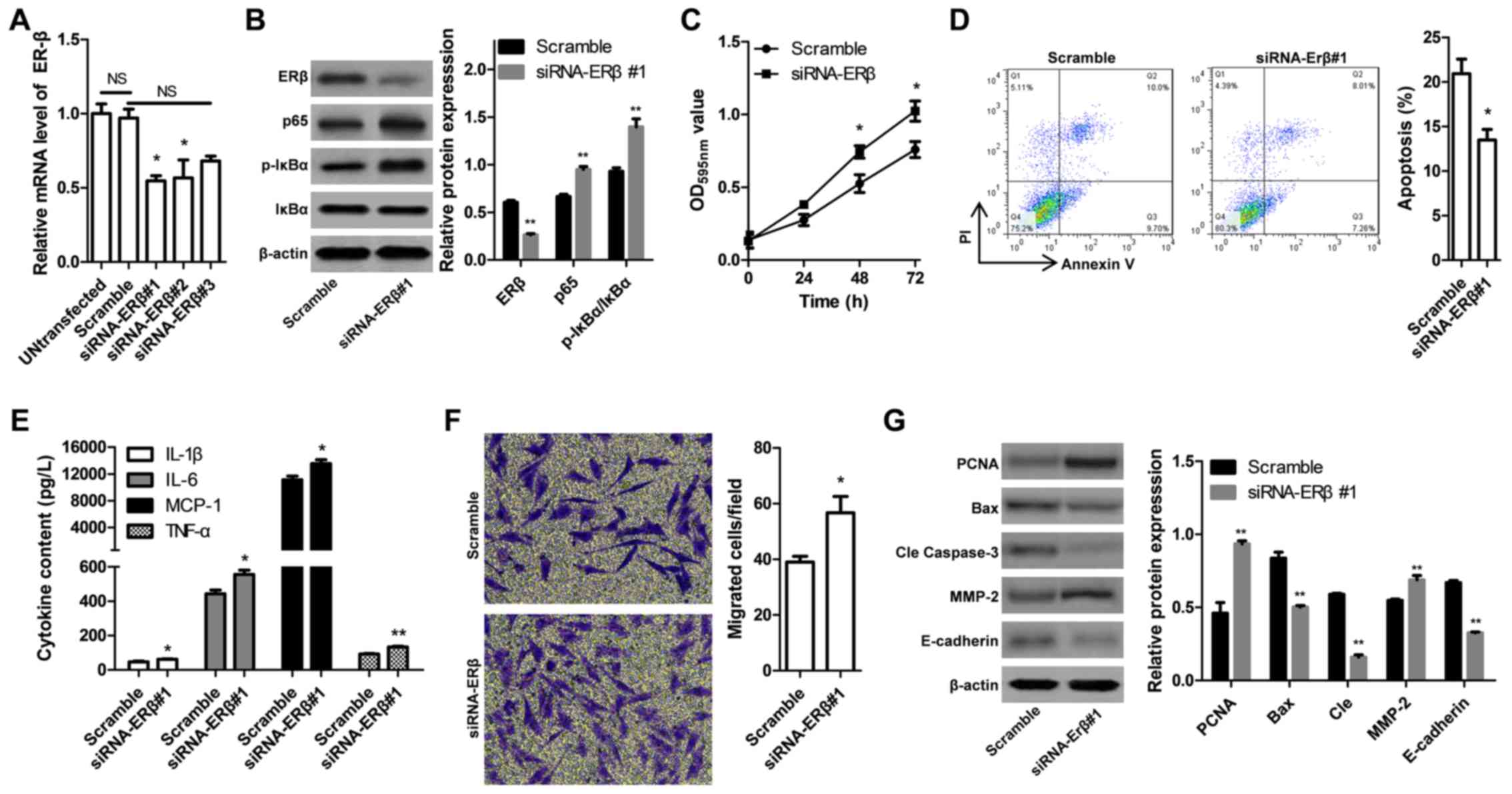 To further investigate the effects of ERβ on the progression of prostate cancer, ERβ-targeting siRNAs were employed to downregulate ERβ expression in DU145 prostate cancer cells. The silencing effects of three siRNAs compared with a negative control scramble siRNA were reported via RT-qPCR analysis (Fig. 5A); siRNA-ERβ#1 was selected for subsequent experiments, as it exhibited a notable effect on ERβ expression compared with siRNAs-ERβ#2 and 3. Decreased levels of ERβ protein expression in prostate cancer cells following transfection with siRNA-ERβ#1 were demonstrated via western blot analysis (Fig. 5B). ERβ knockdown induced similar effects to treatment with PHTPP; increased expression of p65 and p-IκBα was observed, but not of total IκBα compared with scramble-transfected cells (Fig. 5B). Furthermore significantly increased cell viability (Fig. 5C), decreased number of apoptotic cells (Fig. 5D), upregulated expression of proinflammatory cytokines (Fig. 5E), enhanced cell migration (Fig. 5F) and altered expression of associated proteins (Fig. 5G) were reported in DU145 prostate cancer cells following transfection with siRNA-ERβ#1 compared with scramble-transfected cells. Collectively, these findings indicated that upregulation of ERβ reduced the viability and migration, and increased the apoptosis of human prostate cancer cells, which may suppress the progression of prostate cancer.