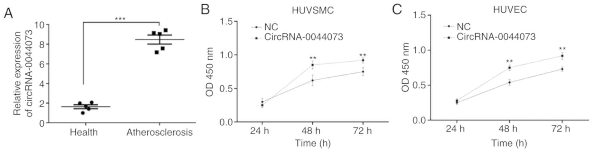 The present study identified that the expression of circRNA-0044073 in blood cells was significantly increased in patients with atherosclerosis compared with that of healthy controls (P<0.001; Fig. 1A). Therefore, we hypothesized that circRNA-0044073 serves a key role in atherosclerosis. As the abnormal proliferation of ECs, SMCs and macrophages contribute to the progression of atherosclerosis, the in vitro protocols of the present study included HUVECs and HUVSMCs to determine the effect of circRNA-0044073 on cell growth. It was observed that the overexpression of circRNA-0044073 significantly increased the proliferation of HUVECs and HUVSMCs, compared with control groups, at 48 and 72 h (P<0.01; Fig. 1B and C). These results suggest a potential association between the upregulation of circRNA-0044073 and proliferation of atherosclerosis-associated cells.