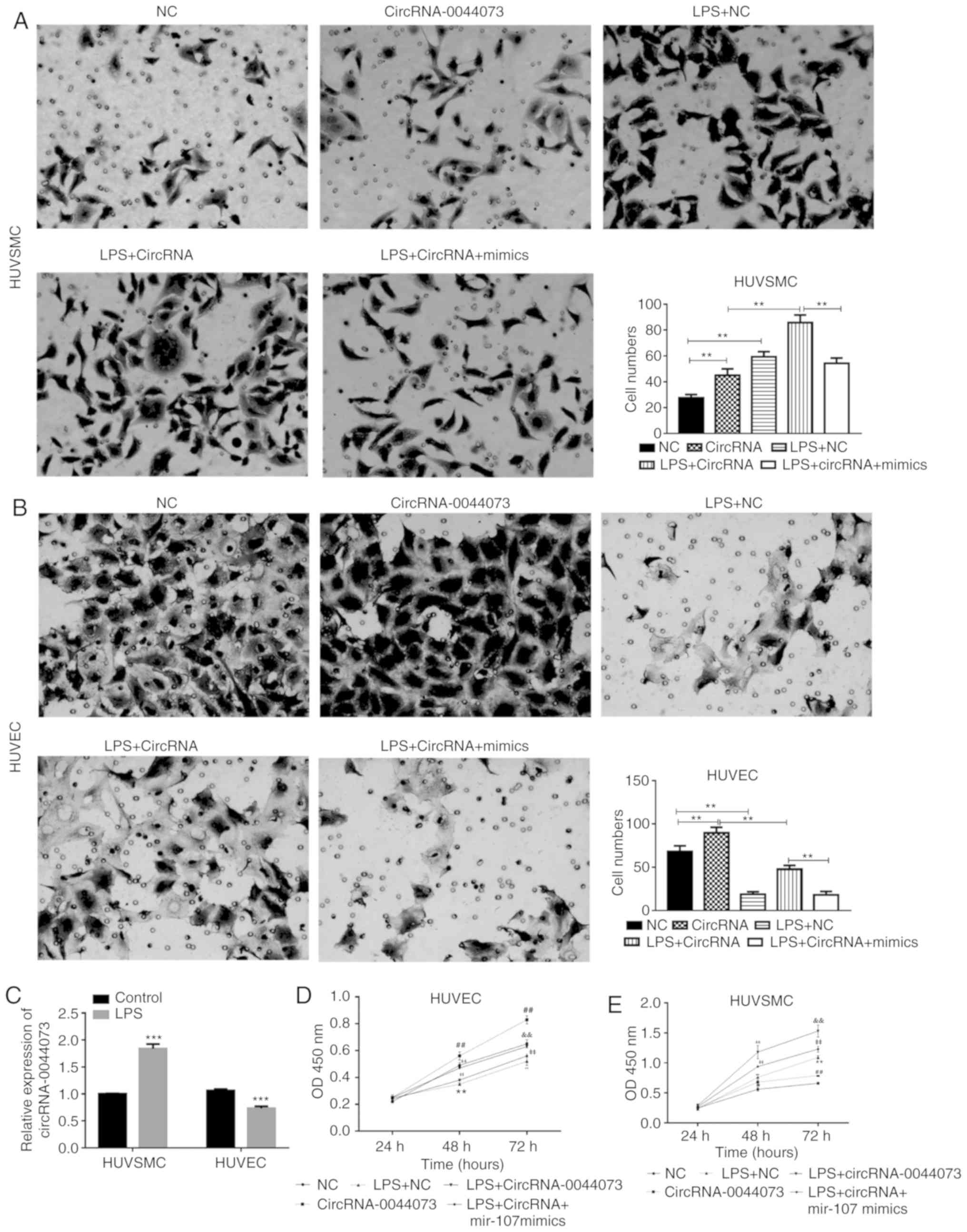 All reagents for cell culture were obtained from Invitrogen; Thermo Fisher Scientific, Inc. (Waltham, MA, USA). Human umbilical vein endothelial cells (HUVECs) were purchased from the American Type Culture Collection (ATCC, Manassas, VA, USA), and human umbilical vein smooth muscle cells (HUVSMCs) were purchased from iXCells Biotechnologies (San Diego, CA, USA). HUVECs and HUVSMCs cells were maintained in minimum essential medium-L-glutamine (Sigma-Aldrich; Merck KGaA, Darmstadt, Germany), smooth muscle cell growth medium and RPMI-1640 medium (Gibco; Thermo Fisher Scientific, Inc.). The medium was supplemented with 10% fetal bovine serum (FBS; Gibco; Thermo Fisher Scientific, Inc.) and 1% penicillin-streptomycin-amphotericin. The cells were maintained in a humidified incubator with 5% CO2 at 37°C. The culture medium was changed twice weekly. HUVECs and HUVSMCs were sub-cultured subsequent to reaching 80% confluency. For the following assay, the cells initially received either 100 ng/ml lipopolysaccharide (LPS) or vehicle. The template DNA of circRNA-0044073 was synthesized and then inserted into the multiple cloning site in the pAd-Track-cmv vector (Addgene, Inc., Cambridge, MA, USA). A total of 500 ng of plasmid DNA was subsequently transfected into HUVECs or HUVSMCs in 24-well plates using Lipofectamine® 2000 (Invitrogen; Thermo Fisher Scientific, Inc.) to increase circRNA-0044073 expression, whereas, the empty vector was transfected as the negative control (NC). Following 48 h of incubation, the transfected cells were used in the following experiments.