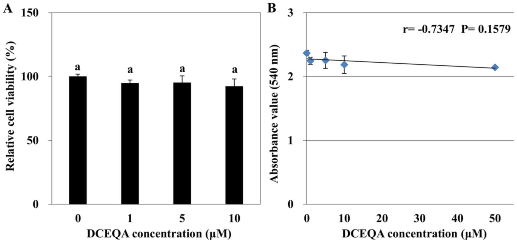 The viability of HaCaT cells was analyzed by using ability of viable cells to convert MTT to an insoluble formazan product that can be quantified with a colorimetric method. Cells were cultured in 96-well plates and incubated for 24 h prior to washing with PBS and treatment with different concentrations (1, 5 and 10 µM) of DCEQA introduced with a serum-free fresh medium. After incubation for 24 h, the supernatant was removed and 100 µl of 1 mg/ml MTT in PBS was added to the culture wells. The MTT solution was then removed after 4 h of incubation and 50 µl DMSO was introduced to each well to stop the reaction and quantify the converted MTT. Optical density of the wells was measured at a wavelength of 540 nm using a GENios® microplate reader (Tecan Group, Ltd., Mannedorf, Switzerland). MTT test was conducted in triplicate wells for each condition and repeated at least thrice. Viability of the cells was plotted as a relative percentage against the untreated control cell group.