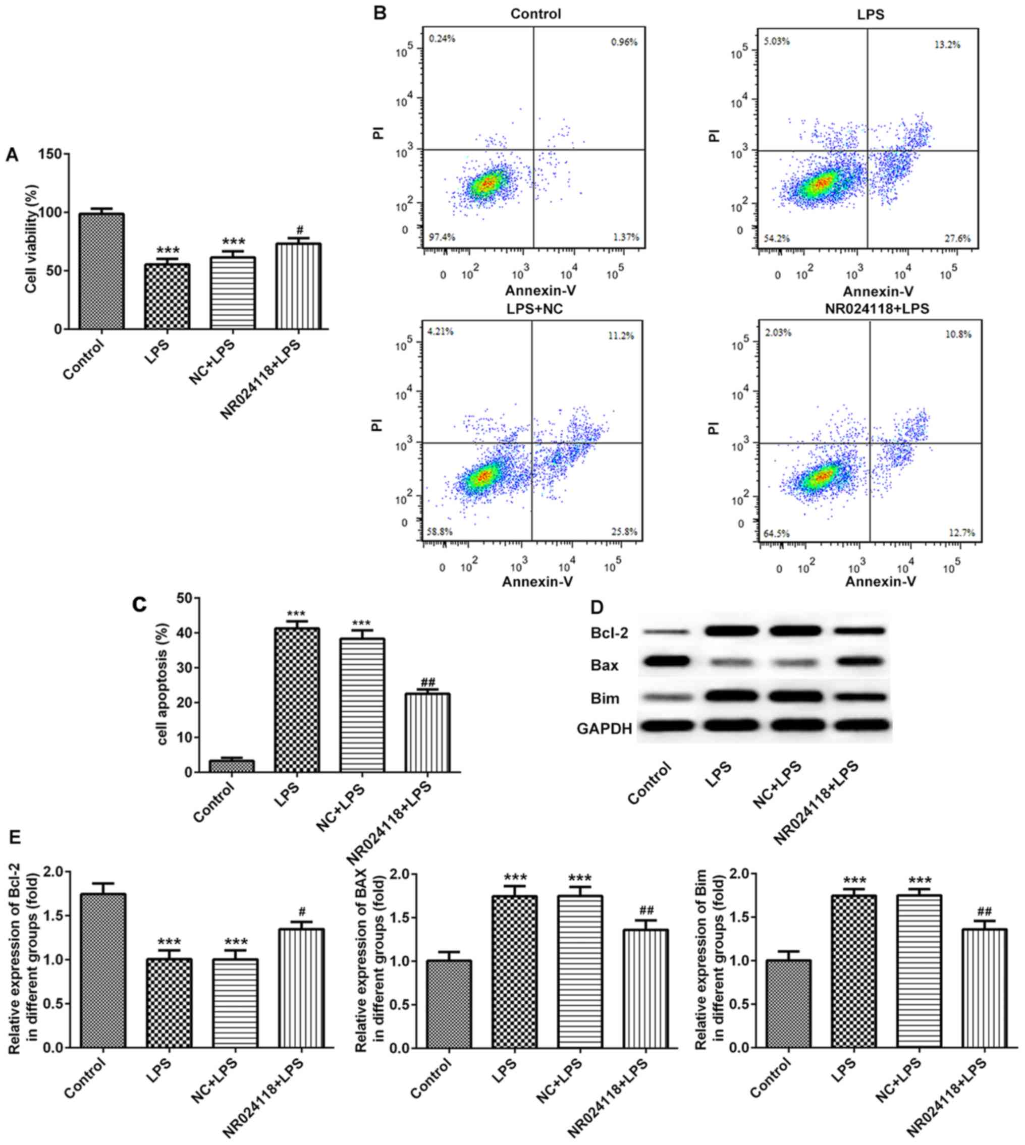 The effect of NR024118 on LPS-induced chondrocyte apoptosis was determined using a CCK-8 assay and flow cytometry. The results indicated that the levels of the LPS-induced decrease in cell viability and induction of apoptosis were decreased in cells transfected with NR024118 (Fig. 2A-C). In addition, in the LPS-induced cells, Bcl-2 and Bim expression were upregulated, and Bax was downregulated compared with the control; these results were reversed in cells transfected with NR024118.