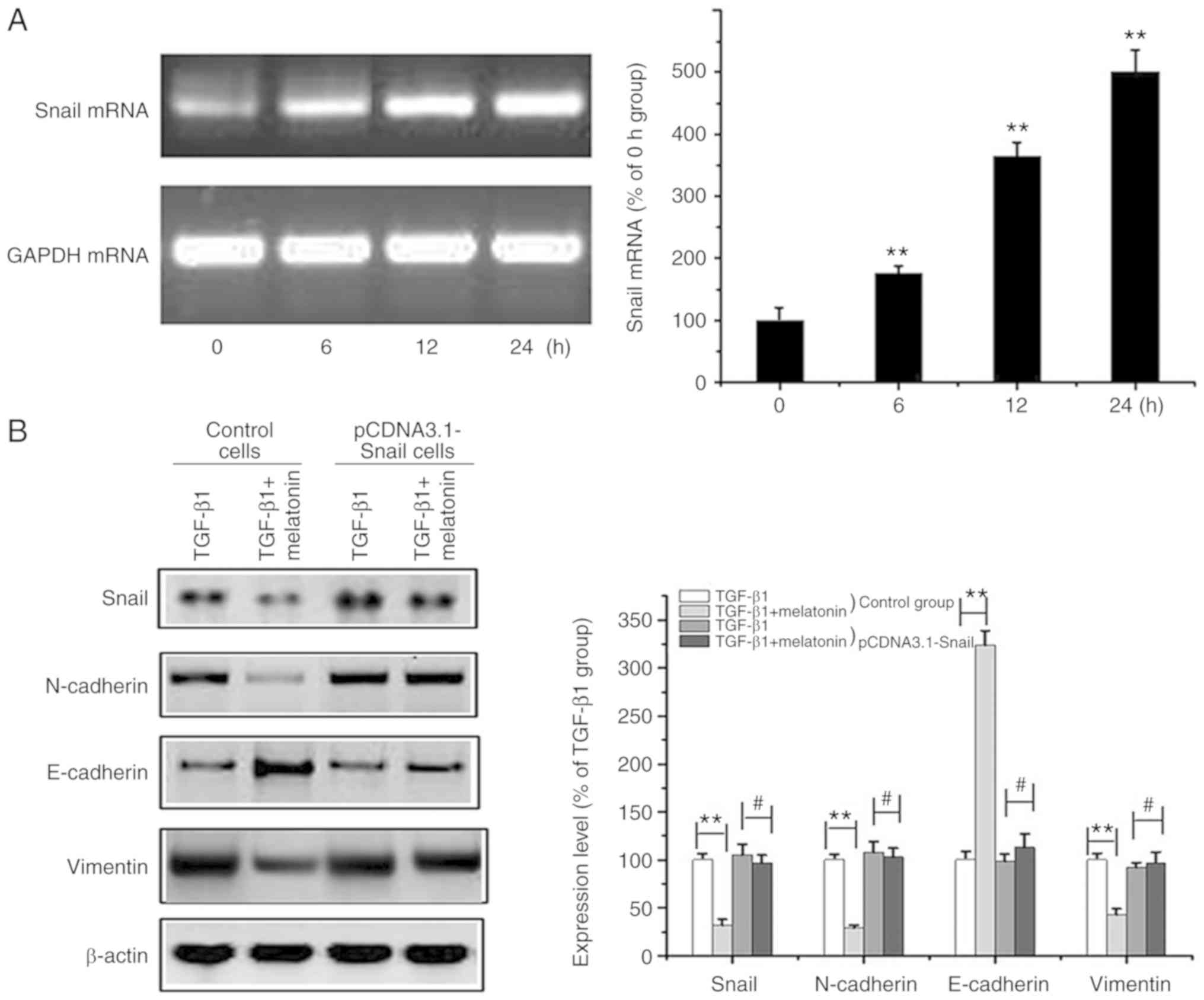 Melatonin, trypsin, MTT and Triton X-100 were purchased from Sigma Chemical Co./Merck KGaA. Dulbecco's modified Eagle's medium (DMEM), penicillin-streptomycin and fetal bovine serum (FBS) were purchased from Gibco Laboratories (Thermo Fisher Scientific, Inc.); TGF-β1 was purchased from (R&D); YC-1 (cat. no. sc-202856) was purchased from Santa Cruz Biotechnology, Inc. Antibodies against MMP-9 (cat. no. sc-13520), E-cadherin (cat. no. sc-52327), N-cadherin (cat. no. sc-8424), vimentin (cat. no. sc-53464), Snail (cat. no. sc-10437), β-actin (cat. no. sc-69879) and HIF-1α (cat. no. sc-53546) were purchased from Santa Cruz Biotechnology, Inc. The ECL kit was purchased from Pierce/Thermo Fisher Scientific, Inc. RIPA buffer and the BCA protein assay kit were purchased from Beyotime. PVDF membranes were purchased from Millipore. All reagents used were trace element analysis grade. All water used was glass distilled.