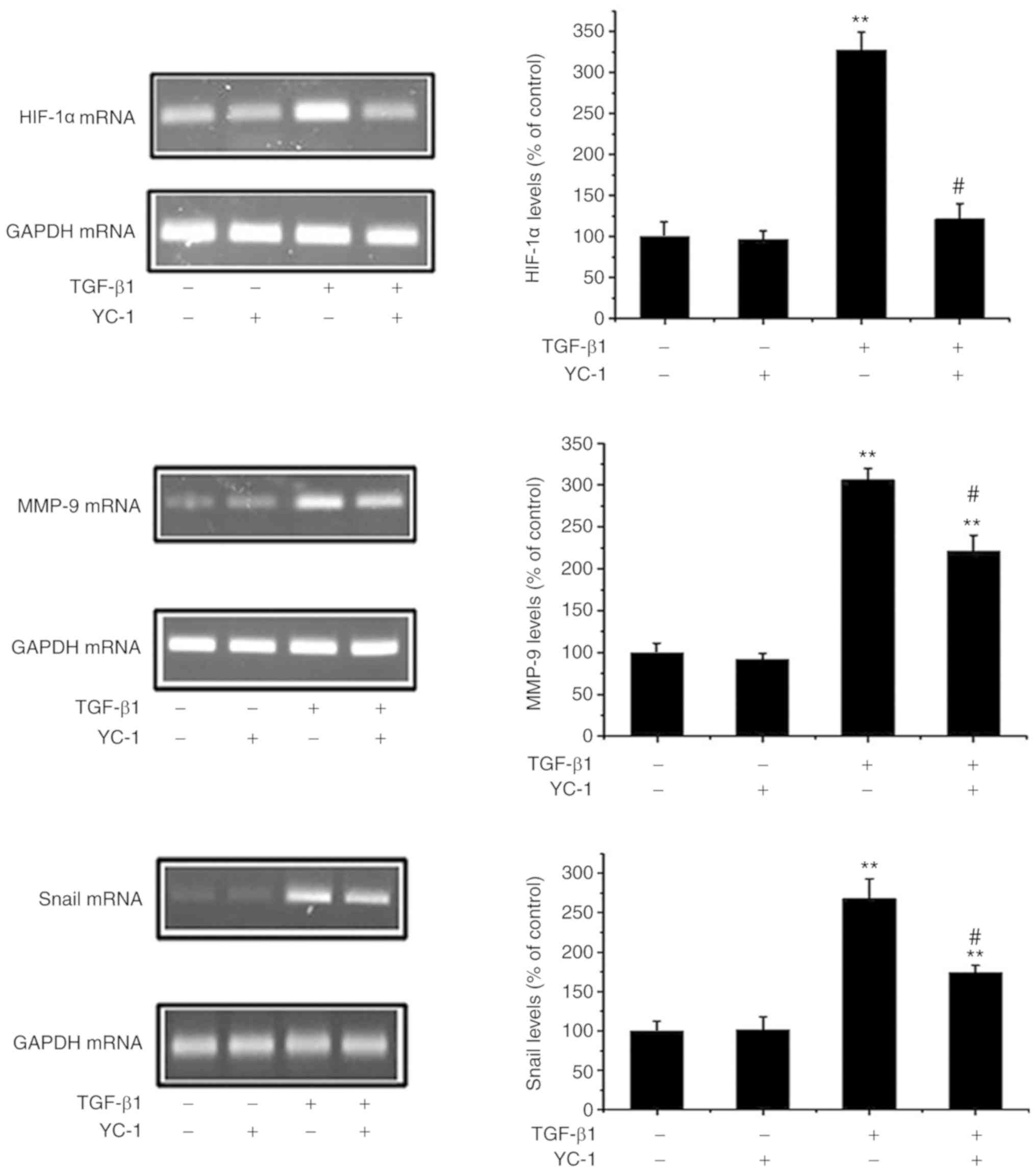 HIF-1α can induce EMT and metastasis in cancer cells (18). Next, it was ascertained whether a loss of HIF-1α negatively affects the Snail/MMP pathways. As shown in Fig. 5, the HIF-1α inhibitor YC-1 not only downregulated HIF-1α expression, but markedly inhibited the upregulation of Snail and MMP-9 in response to TGF-β1. These data provide evidence that HIF-1α activates Snail/MMP-9 expression and that inhibition of HIF-1α attenuates EMT in MG-63 cells.