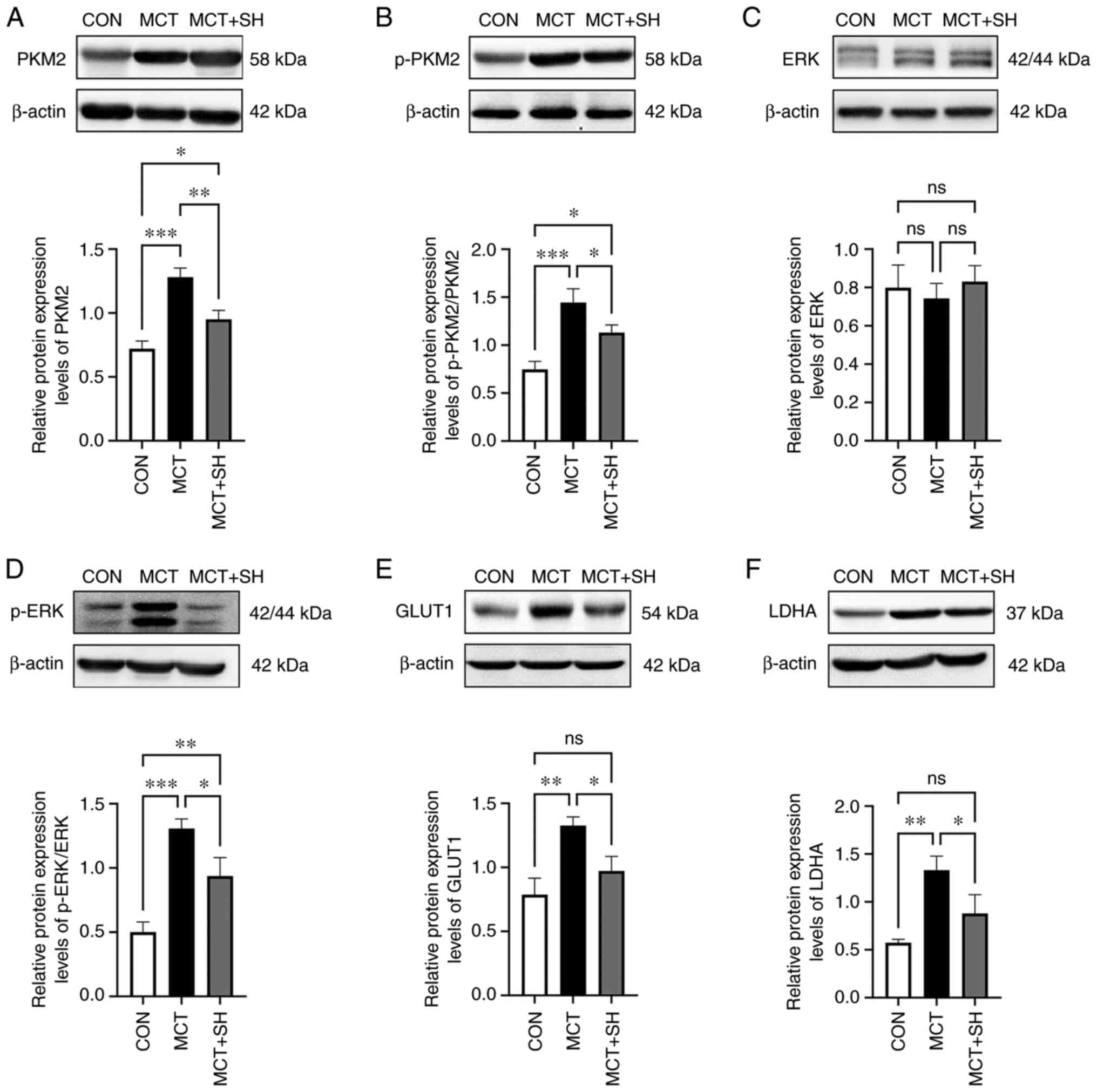 There were certain limitations to the present study. During the modeling process, 2 deaths occurred in the MCT group and 1 death occurred in the MCT + SH group. The two rats in the MCT group died of severe pulmonary hypertension and the rat in the MCT+SH group died of massive bloody ascites and severe peritonitis due to accidental puncture of the intestinal tube by the needle tip during intraperitoneal injection of shikonin. Moreover, in the present study, specific regulatory mechanisms between PKM2 and downstream signaling pathways were not evaluated. Therefore, the effects of shikonin on aerobic glycolysis and downstream signaling process require further evaluation in future studies.