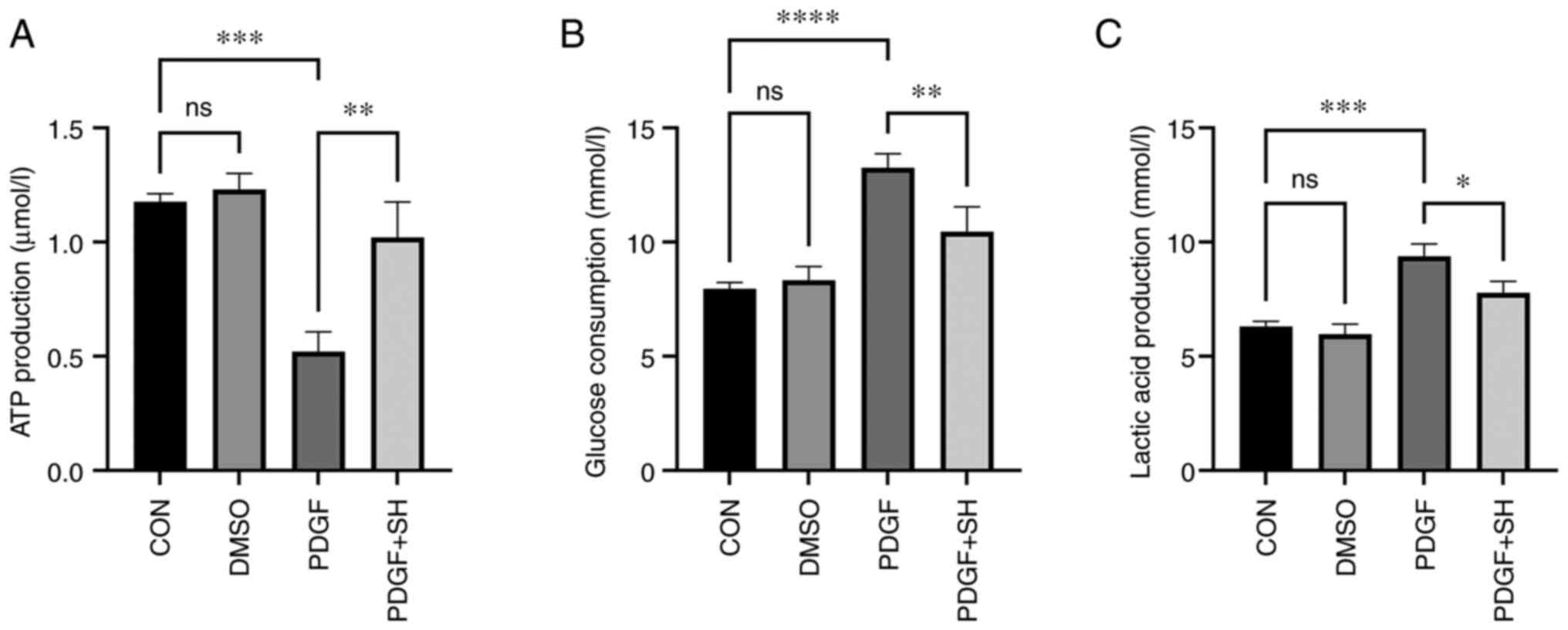 Extracellular glucose consumption, lactic acid production and cellular ATP levels were assessed to evaluate whether shikonin improved PAH through inhibition of the Warburg effect. The results demonstrated significant increases in glucose consumption and lactic acid generation and a significant decrease in ATP generation in PDGF-treated PASMCs compared with the control. Shikonin significantly suppressed the PDGF-induced Warburg effect in vitro (Fig. 8).