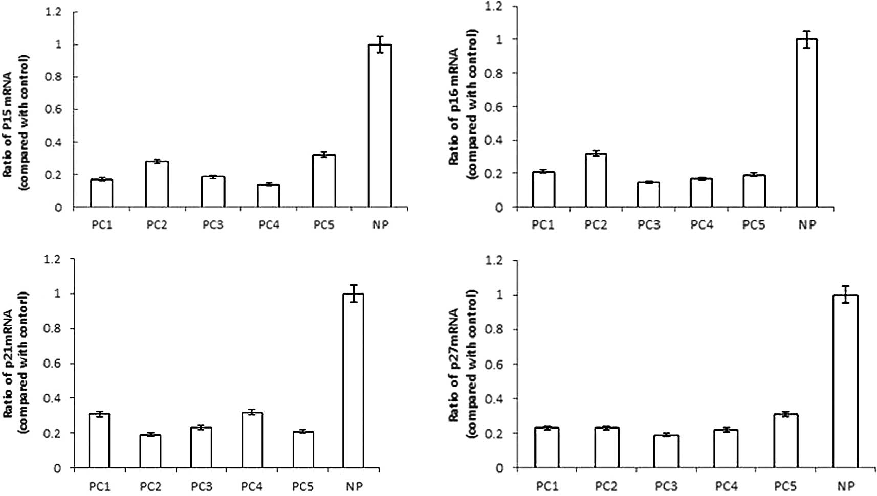 Subsequently, we were interested in whether aberrant mRNA expression levels contributed to these CDKI alterations in pancreatic carcinoma specimens from patients. We evaluated p15INK4b, p16INK4a, p21cip1 and p27kip1 mRNA by real-time RT-PCR analysis to determine whether decreased mRNA accumulation contributed to their protein levels. As shown in Fig. 2, it was preceded by a >3-fold reduction in p15INK4b mRNA expression, a >4-fold reduction in p16INK4a mRNA expression, a >3-fold reduction in p21cip1 mRNA expression and a >4-fold reduction in p27kip1 mRNA expression of PC specimens, as compared to human NP tissue. Our findings suggested that the reduced levels of p15INK4b, p16INK4a, p21cip1 and p27kip1 proteins were likely due to a reduction in their mRNA synthesis, stability or translation in pancreatic carcinoma.
