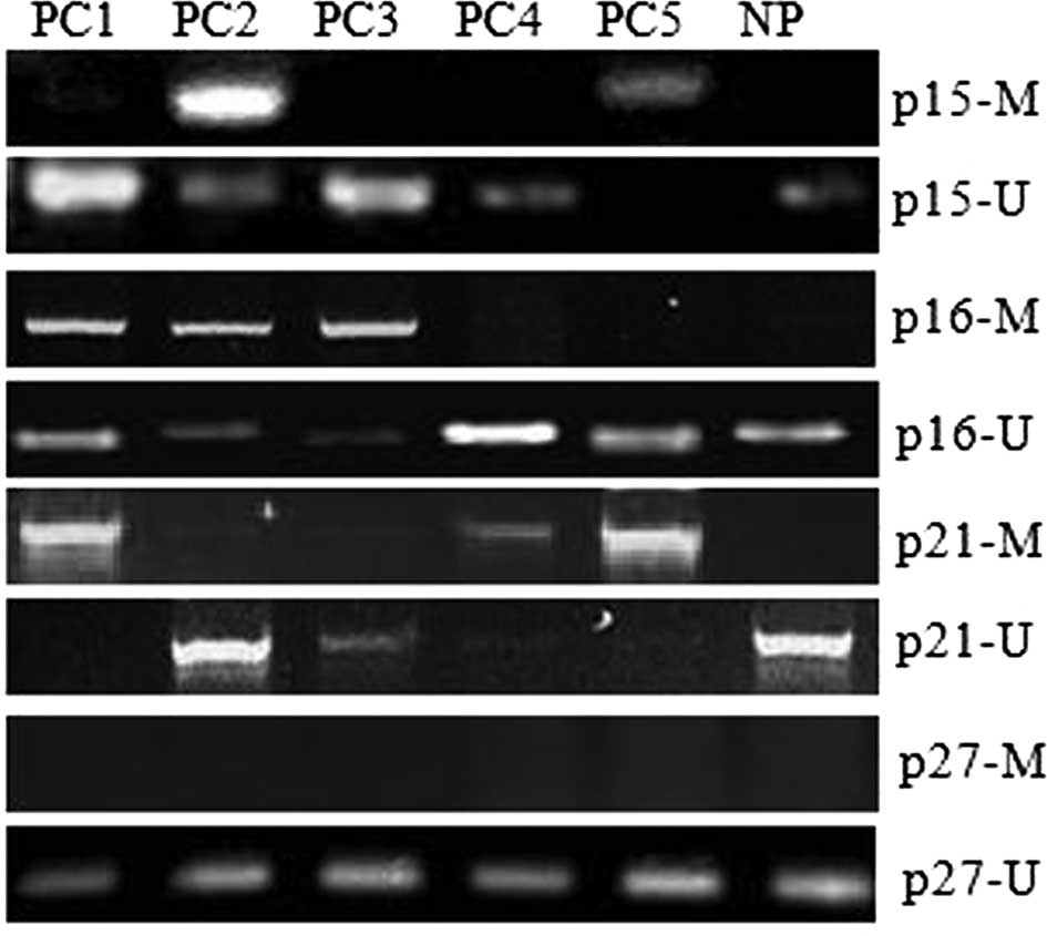 To explore the mechanism associated with the transcriptional silencing of the p15INK4b, p16INK4a, p21cip1 and p27kip1 genes, we examined 5 PC and human NP tissue samples to see whether there was methylation alteration in a CpG-rich region of the transcription initiation site of the these genes. The presence or absence of methylation in the promoters of the p15INK4b, p16INK4a, p21cip1 and p27kip1 genes was determined by MSP. MSP distinguishes unmethylated from methylated alleles based on sequence changes produced following bisulfite treatment of DNA, which converts unmethylated cytosine to uracil, and subsequent PCR using primers designed for either methylated or unmethylated DNA. As shown in Fig. 3, promoter hypermethylation was detected in PC2 and PC5 samples in the p15INK4b gene, PC1, 2 and 3 samples in the p16INK4a gene or PC1, 4 and 5 samples in the p21cip1 gene, while no detectable promoter hypermethylation of the p27kip1 gene was found in all 5 PC samples. No detectable promoter hypermethylation of the p15INK4b, p16INK4a, p21cip1 and p27kip1 genes was found in human NP tissue samples (Fig. 3). Thus, aberrant DNA promoter hypermethylation of the p15INK4b, p16INK4a and p21cip1 genes was thought to play a role in several cases of pancreatic carcinoma that had markedly decreased expression of p15INK4b, p16INK4a and p21cip1 mRNA, concomitant with loss of p15INK4b, p16INK4a and p21cip1 proteins, but not p27kip1 protein (Figs. 2 and 3). Thus, we suggest that DNA hypermethylation associated with transcriptional silencing of the p15INK4b, p16INK4a and p21cip1 genes may partly contribute to pancreatic carcinoma progression.