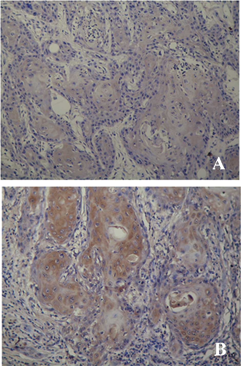 Patients (n=45) with stage I to IV OSCC who underwent radical surgery at the Department of Oral and Maxillofacial Surgery, Shanghai Ninth People's Hospital, Shanghai Jiao Tong University School of Medicine, Shanghai, China between January 2002 and December 2002, who had not undergone radio-or chemotherapy, were enrolled into this prospective study. All of the tumors were classified according to the International Union Against Cancer (UICC) tumor/lymph node/metastasis (TNM) classification system (9). Histological diagnoses of OSCC were made according to the criteria of the World Health Organization (WHO) for the histological typing of cancer (10). Patients were biopsied and histopathologically examined at the Ninth People's Hospital, Shanghai Jiao Tong University School of Medicine, Shanghai, China. Patients were prospectively evaluated (chest X-ray or thoracic CT scan, abdominal sonography or CT scan or MRI and serum chemistry) every 3 months for the first 2 years after surgery, every 6 months for the following 3 years and annually thereafter. This study was approved by the ethics committee of Shanghai Ninth People's Hospital. Informed consent was obtained from each patient. A total of 45 patients with follow-up periods up to 8.3 years were included in the study. Annual follow-up data were retrieved from the medical records. The specimens were fixed in 10%-buffered formalin and embedded in paraffin wax. Paraffin blocks were sectioned into 4 μm slices.