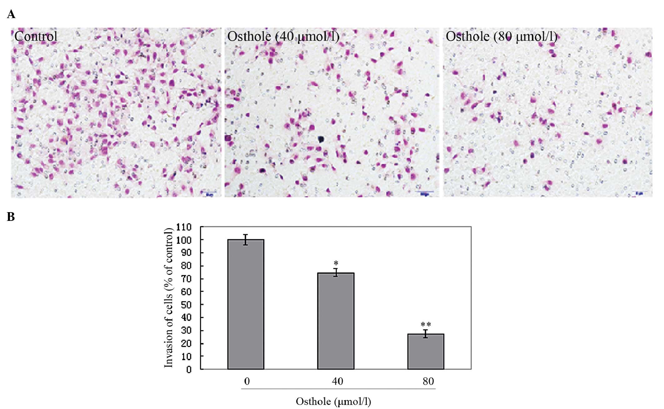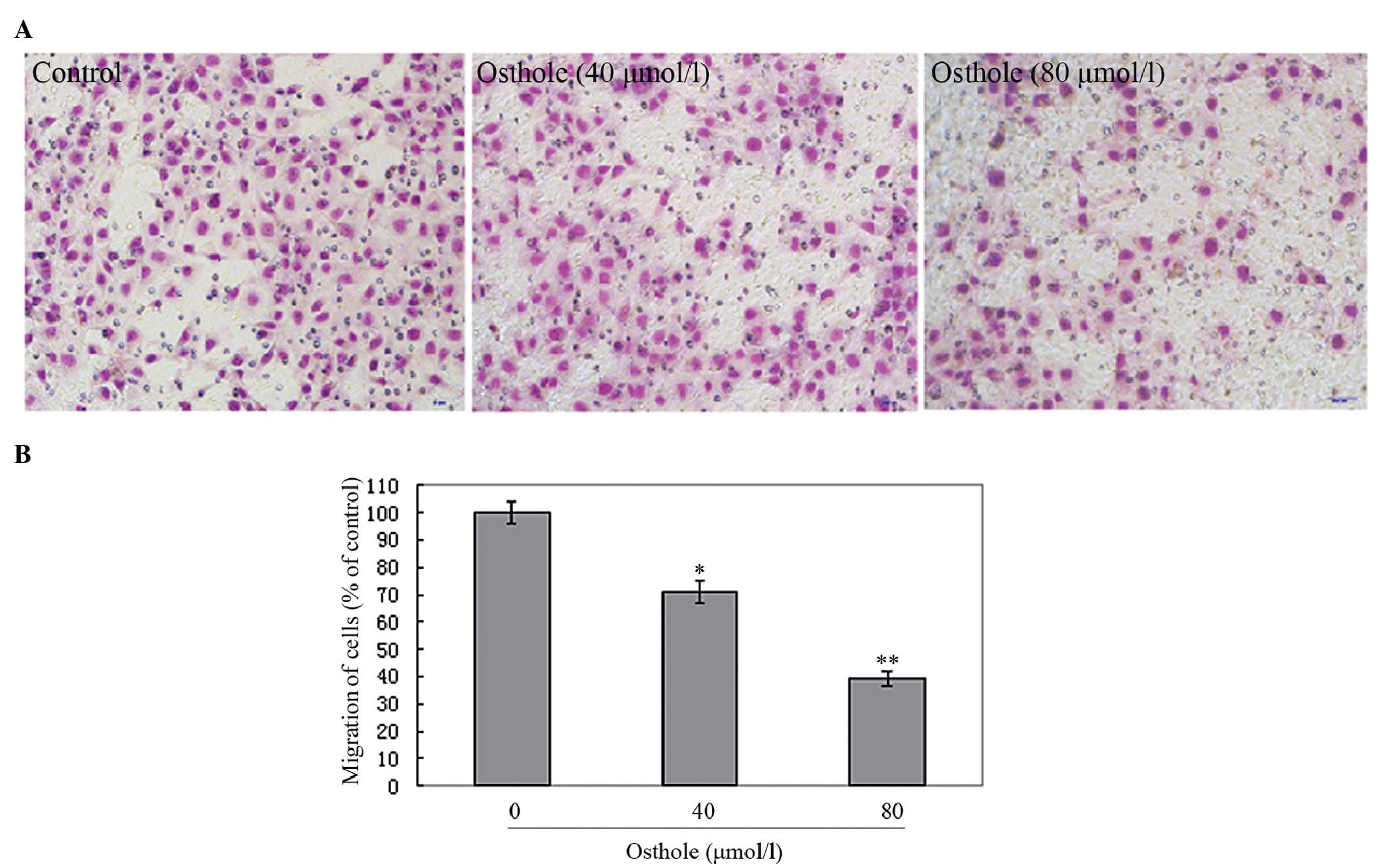 In a previous study, we reported that osthole induces G2/M arrest and apoptosis in A549 human lung cancer cells by modulating the PI3K/Akt pathway (16). However, the effects of osthole on the migration and invasion of human lung cancer cells remain unclear. The purpose of the current study was to investigate the effects of osthole on the induction of migration and invasion in A549 human lung cancer cells. We also aimed to investigate whether the effects of osthole on the migration and invasion of A549 cells were mediated through the inhibition of matrix metalloproteinase-2 (MMP-2) and matrix metallopeptidase-9 (MMP-9). The findings should indicate whether osthole has the ability to inhibit the metastasis of human lung cancer.