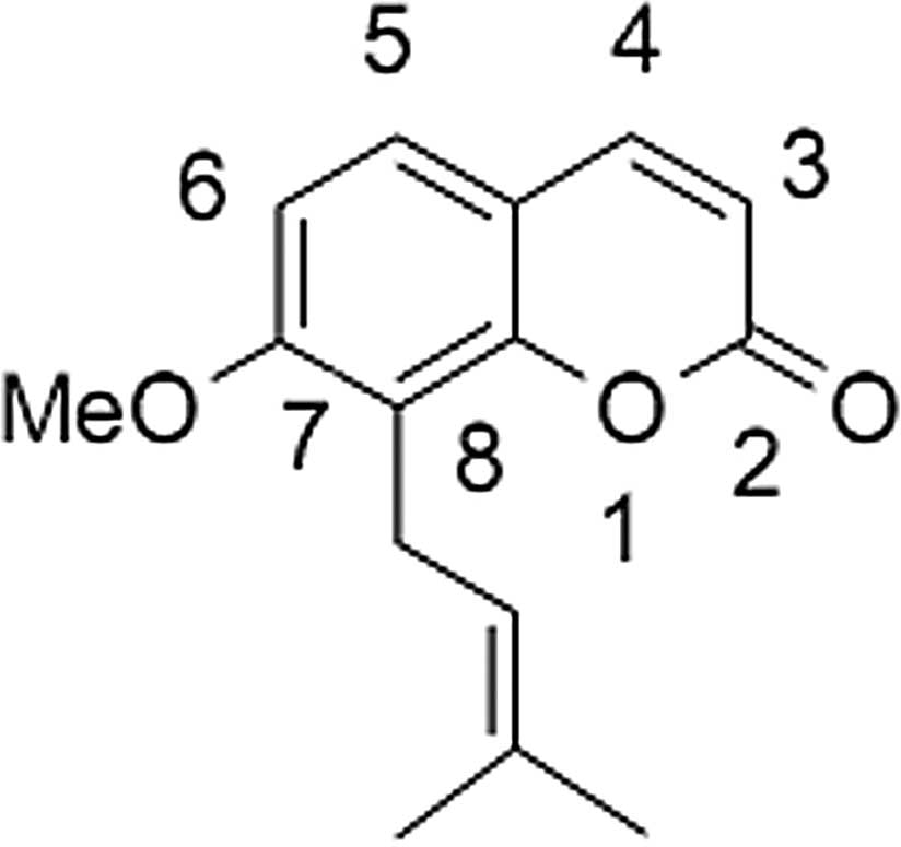 Osthole, 7-methoxy-8-(3-methyl-2-butenyl)coumarin (Fig. 1), a natural compound, may be extracted from Cnidium monnieri and other medicinal plants. Previous studies have revealed that osthole has antiproliferative (8), vasorelaxant (9), anti-inflammatory (10), antimicrobacterial (11) and antiallergic (12) properties. Furthermore, the anticancer effect of osthole has been described. It has been reported that osthole is able to abrogate HGF-induced cell scattering, migration and invasion in MCF-7 breast cancer cells (13). Osthole is also capable of inducing apoptosis in HeLa cells and HL-60 leukemia cells (14,15).