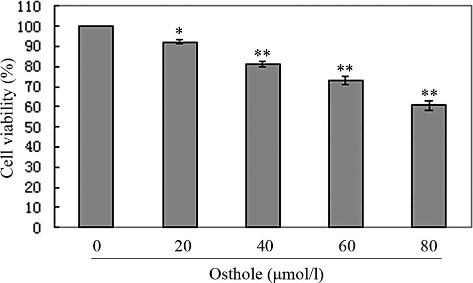 The proliferation of A549 cells following treatment with osthole was measured using the MTT assay. Briefly, A549 cells were plated at a density of 1×104 cells/well in 96 well plates overnight and then treated with various concentrations of osthole (0, 20, 40, 60 and 80 μmol/l). Following a 24 h treatment, 20 μl MTT solution (2 mg/ml in PBS) was added to each well and the cells were cultured for another 4 h at 37°C. The medium was then totally removed and 150 μl DMSO was added to solubilize the MTT formazan crystals. Finally, the plates were shaken and the optical density was determined at 570 nm (OD570) using an ELISA plate reader (Model 550, Bio-Rad, Hercules, CA, USA). At least three independent experiments were performed.