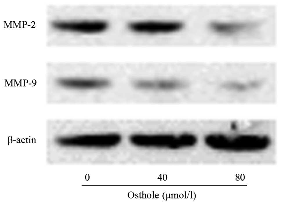 The levels of migration- and invasion-associated proteins during the treatment with osthole were examined by western blotting. As shown in Fig. 5, the levels of MMP-2 and MMP-9 in the osthole-treated cells were lower than those in the control cells. MMP-2 and MMP-9 are significant in lung cancer cell invasion and migration. The inhibitory effects on MMP-2 and MMP-9 may be responsible for the inhibition of the invasion and migration of A549 cells following exposure to osthole.