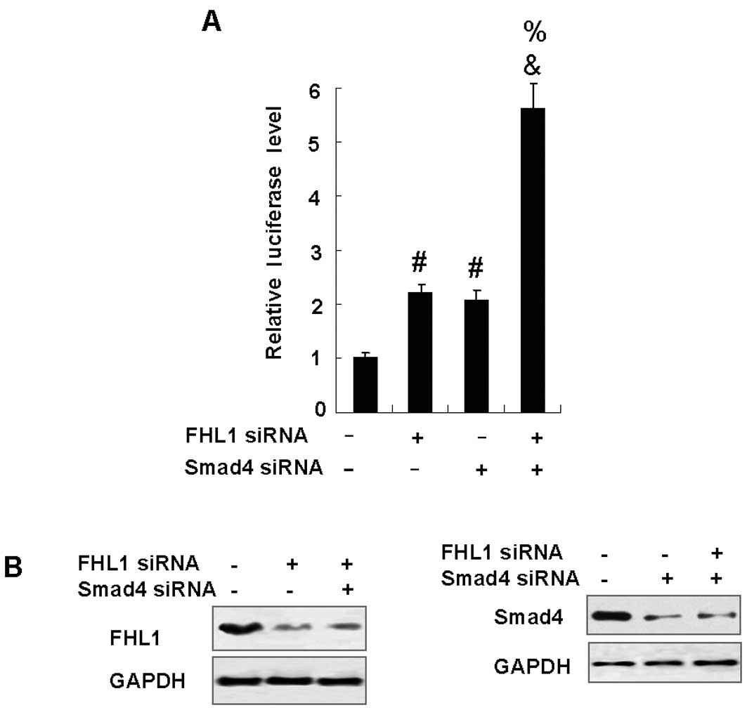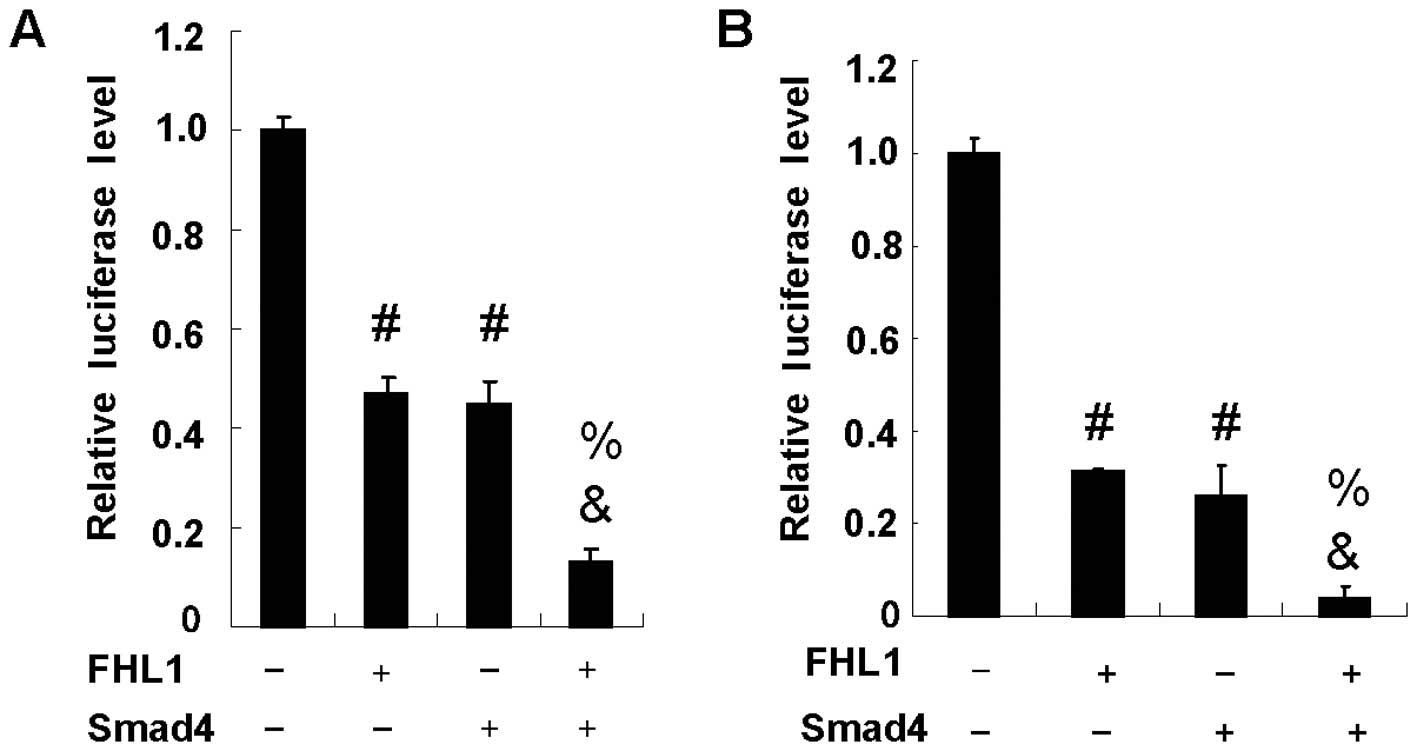 In this study, we have demonstrated for the first time that FHL1 and Smad4 synergistically inhibit VEGF signaling, which has been validated by a number of in vitro experiments, including luciferase reporter, real-time reverse transcription-PCR and ELISA assays.