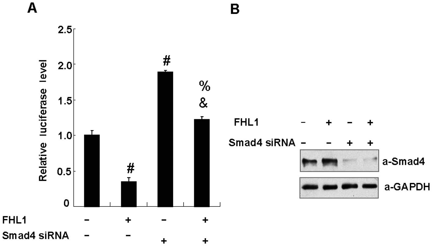 To examine the role of endogenous Smad4 in FHL1 repression of VEGF promoter activity, HepG2 cells were transfected with FHL1 or Smad4 siRNA. As shown in Fig. 3B, Smad4 siRNA effectively inhibited the expression of Smad4 protein 48 h after transfection, whereas control siRNA had no effect. Reduction of Smad4 enhanced the VEGF-Luc reporter activity. Notably, reduction of Smad4 eliminated FHL1 inhibition of the reporter activity, suggesting that FHL1 represses VEGF promoter activity in a Smad4-dependent manner (Fig. 3A).