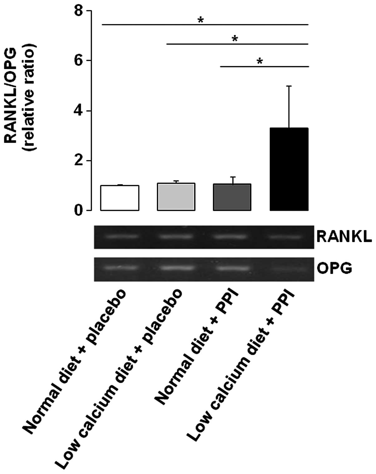 To evaluate the relative ratio of RANKL/OPG, the RT-PCR method was performed. Initially, the gene expression level of RANKL was upregulated by low calcium diet alone and PPI alone, compared with normal diet alone. Expression levels of OPG were also upregulated by PPI alone, compared to that of normal diet alone, which showed a similar pattern to RANKL. However, OPG was markedly downregulated by a low calcium diet with PPI. Consequently, the RANKL/OPG ratio was significantly increased by a low calcium diet with PPI, compared to the other three groups (Fig. 1). Given that OPG binds competitively to RANKL to inhibit RANKL-RANK binding, if the administration of PPI is combined with a low calcium diet, it may enhance the signal transduction through RANK.