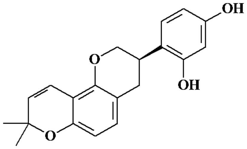 Licorice is the root and stolon of the Glycyrrhiza plant, which belongs to the family Leguminosae. This plant has been medicinally used for >4,000 years (11). It is a Chinese herb commonly used as an expectorant and to arrest coughing, reduce fever, comfort the stomach, alleviate urgency and potentiate the effects of various other herbs (12). Licorice has been reported to attenuate free radical-induced oxidative damage in the kidney, prevent carcinogenesis induced by toxicants or hormones and also has a significant hepatoprotective activity (13–15). Licorice contains flavonoids and triterpenoids (15). Glabridin (Fig. 1), a polyphenolic flavonoid, is a main active component in licorice, which has been reported to exhibit multiple pharmacological activities, such as cytotoxic, antimicrobial, anti-fatigue, estrogenic and anti-proliferative activity against human breast cancer cells (16). It also affects melanogenesis, inflammation, low-density lipoprotein oxidation and protection of mitochondrial functions from oxidative stress (17). However, there is a limited number of studies on the effect of glabridin on DM at present. Thus, the aim of this study was to investigate the hypoglycemic effects of glabridin from licorice in an animal model of DM.
