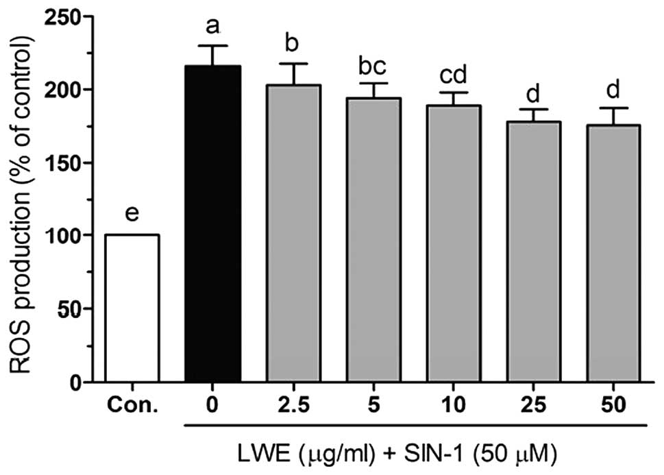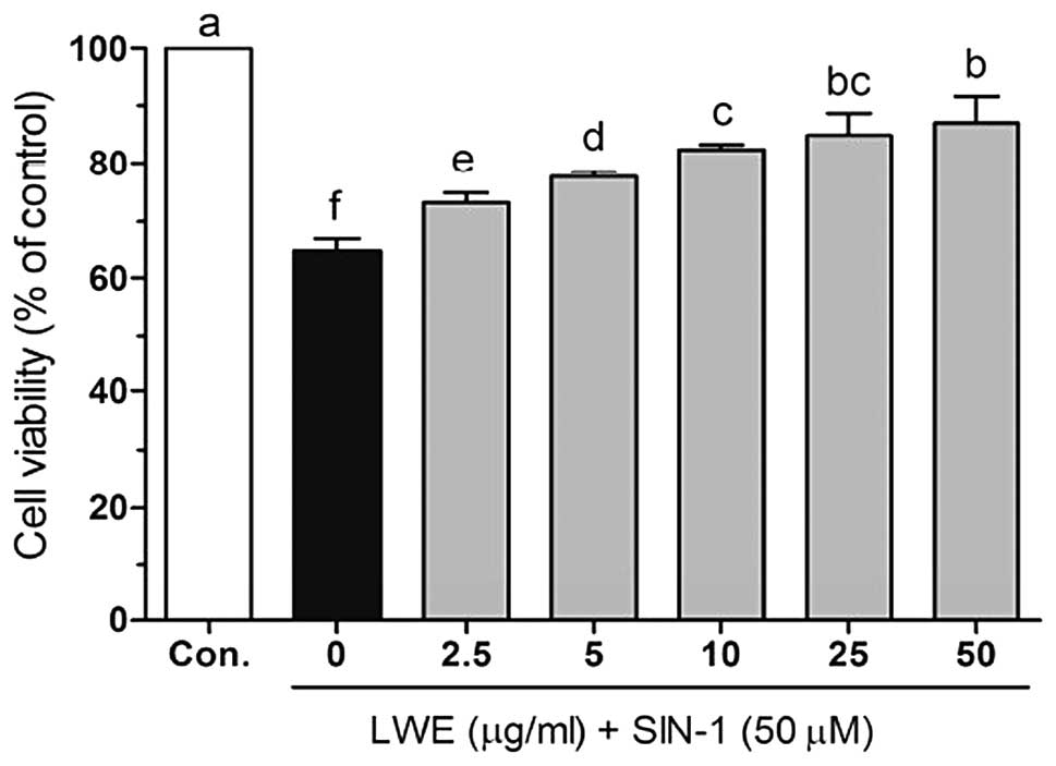 The results of this study clearly showed that LWE prevented SIN-1-induced cell death, as assessed using the MTT assay. Additionally, LWE alone was not significantly cytotoxic to cells at the concentrations used. Treatment with LWE was shown to have a significant protective effect, which may be attributed to the free radical scavenging activity of the extract.