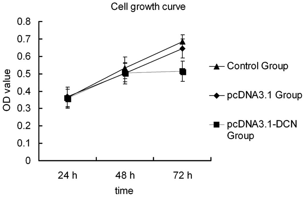 To investigate the cell proliferation inhibitory role of recombinant human decorin, an MTT assay was performed. As shown in Fig. 1, the control group cells and pcDNA3.1 group cells exhibited a higher OD after 72 h transient transfection, whereas in the pcDNA3.1-DCN group, cell proliferation was markedly inhibited at a statistically significant level. This result revealed that recombinant human decorin represses cell growth in HepG2 cells after 72 h of transient transfection and so all of the following experiments were conducted after culturing for 72 h.