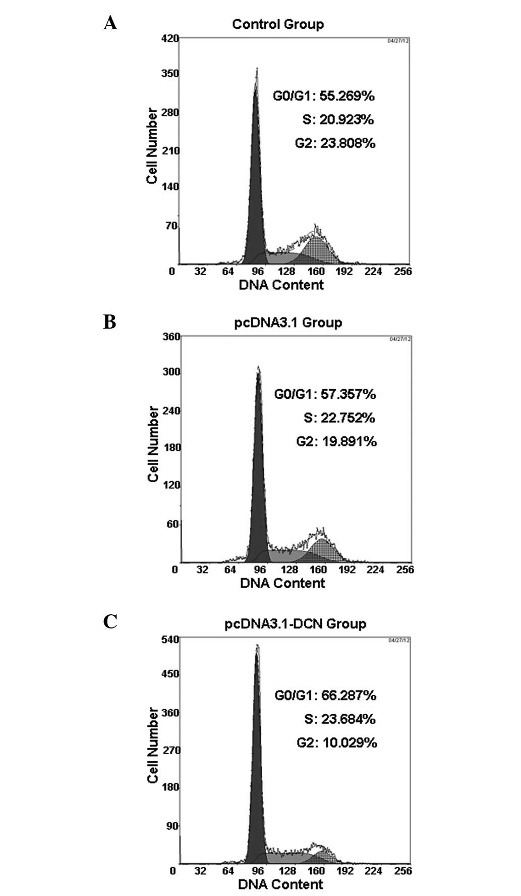Flow cytometry was used to investigate the cell cycle regulatory role of recombinant human decorin in HepG2 cells. Our result revealed that recombinant human decorin caused cell cycle arrest at the G0/G1 phase in HepG2 cells at 72 h following transient transfection (Fig. 2). More HepG2 cell cultures that were treated with pcDNA3.1-DCN accumulated in the G0/G1 phase compared with the control and pcDNA3.1 groups. The percentage of cells in the G0/G1 phase was 66.126±2.701, 57.116±1.421 and 55.323±1.641% in the pcDNA3.1-DCN, pcDNA3.1 and control groups, respectively (Table I).