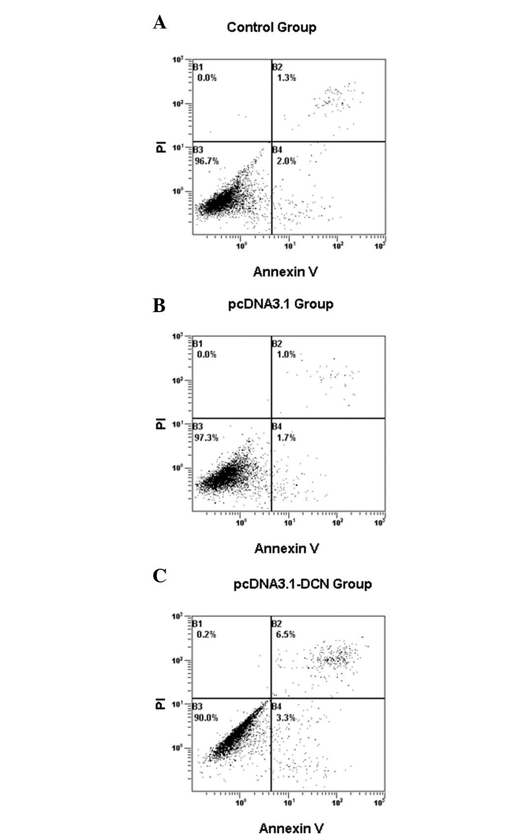 Analysis was conducted by cultivating cells in 6-well plates (3×105 cells per well) treated with pcDNA3.1-DCN, pcDNA3.1 and/or with neither pcDNA3.1 nor pcDNA3.1-DCN for 72 h and then trypsinized. Apoptosis was determined using the Annexin V-FITC Apoptosis kit (Becton-Dickinson). The cells were analyzed using flow cytometry in triplicate. The experiment was performed in triplicate.