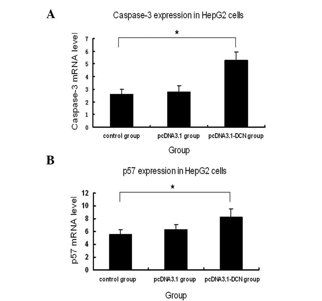 We examined the effect of recombinant human decorin on the induction of apoptosis and, as shown in Fig. 3, recombinant decorin induced apoptosis. The proportion of cells stained with annexin V and PI was higher in the pcDNA3.1-DCN group compared with the control and pcDNA3.1 groups (Table II). We measured caspase-3 expression by quantitative RT-PCR in the three human HepG2 groups. As illustrated in Fig. 4, caspase-3 expression was markedly increased in the pcDNA3.1-DCN group compared with the pcDNA-3.1 and control groups. There was no statistically significant difference in the expression of caspase-3 between the control group and pcDNA3.1 group (P>0.05).