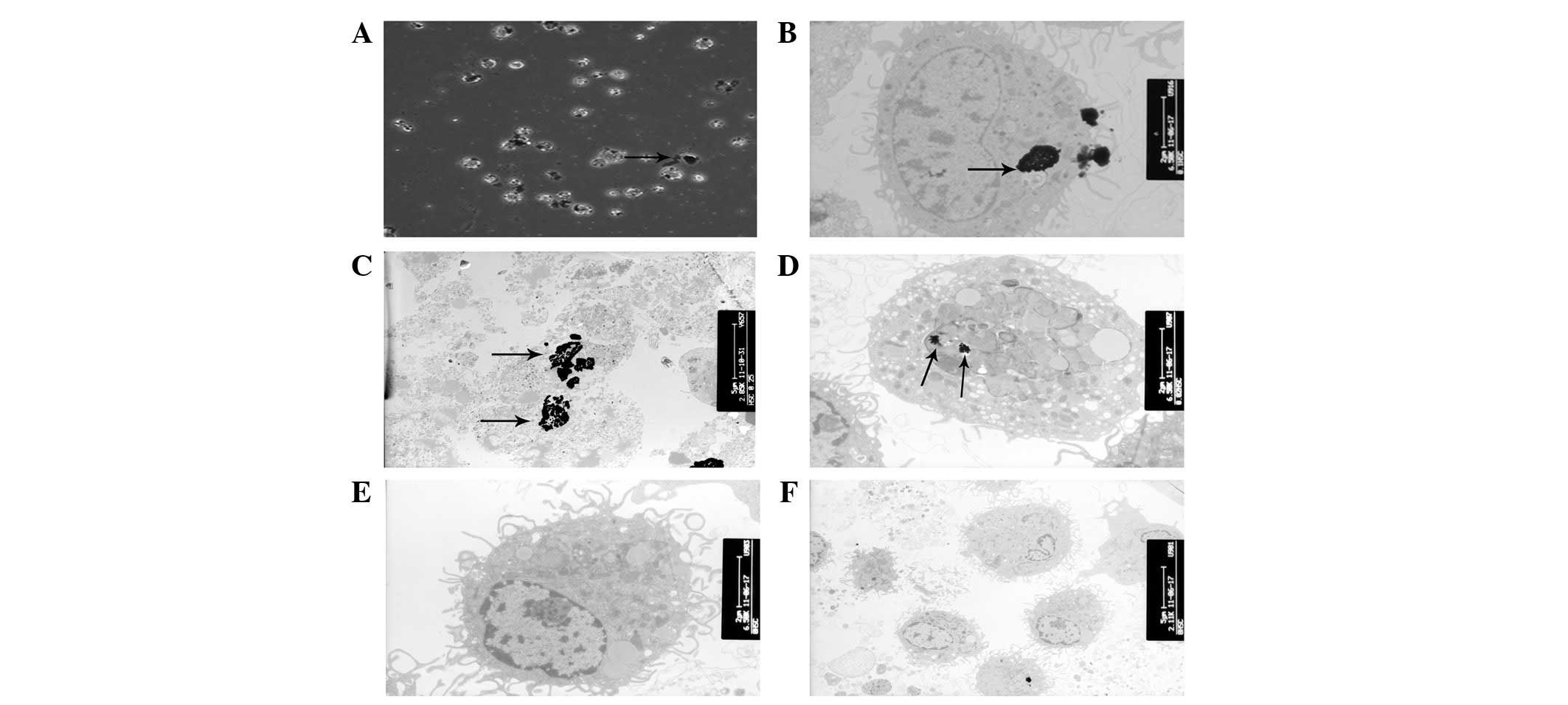 Transmission electron microscopy (TEM; CM12; Philips, Amsterdam, Netherlands) was used to examine the morphology of HSCs. HSCs were seeded in 100-mm tissue culture dishes, cultured for 2 days and treated with different concentrations of AgNPs for 24 h.