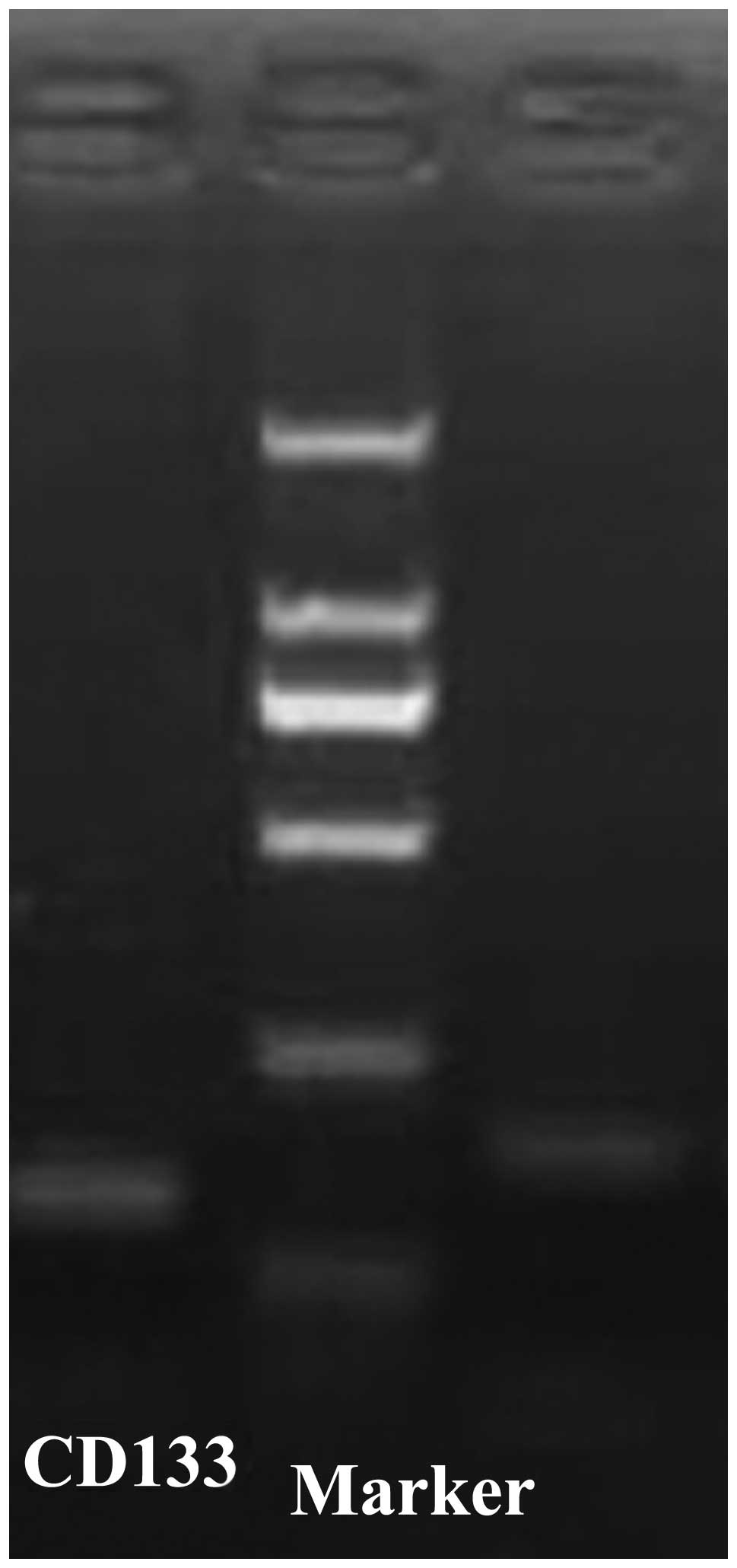 Cells were homogenized in TRIzol reagent (Invitrogen, Carlsbad, CA, USA). Total RNA was extracted from cells according to the manufacturer’s instructions. The concentration of total RNA was measured by ultraviolet spectrophotometry; an optical density (OD) 260/280 ratio between 1.8 and 2.0 was deemed to be acceptably pure. Reverse transcription was performed according to the manufacturer’s instructions. Briefly, l μg of total RNA and the Moloney Murine Leukemia Virus (MMLV) reverse transcriptase (Fermentas, Burlington, Canada) in a 20 μl reaction volume consisting of 0.5 μg/μl of oligo d(T) primer, 1 μl of random primers (0.2 μg/μl) and 10 μl of DEPC-H2O. The reaction mix was first pre-denatured at 65°C for 10 min. Following the addition of 200 U M-MLV reverse transcriptase (Fermentas), the samples were incubated at 42°C for 1 h and annealed at 70°C for 10 min. The synthesized cDNA was used as a template for real-time fluorescent quantitative PCR using the fluorescent dye SYBR Green and the Eppendorf Realplex 4 real-time PCR system (Eppendorf, Hamburg, Germany). The 20 μl reaction mixture consisted of 10 μl of 2X SYBR Green, 1 μl of template, 1 μl of upstream and downstream specific primers and 8 μl of deionized water. The reaction mixture was pre-denatured at 95°C for 2 min, followed by 40 cycles at 95°C for 15 sec, 59°C for 20 sec and 72°C for 20 sec. Each primer sample was run in triplicate. The primers used were as follows: CD133-forward (F): CACTTACGGCACTCTTCACCTG; CD133-reverse (R): CCAGTCTGAGCCAAGTAGCTGTC. Glyceraldehyde 3-phosphate dehydrogenase (GAPDH) was used as an internal standard for data calibration (GAPDH-F: GGGTGTGAACCATGAGAAGTATG; GAPDH-R: GATGGCATGGACTGTGGTCAT). The lengths of the PCR products were 213 (CD133) and 145 bp (GAPDH).