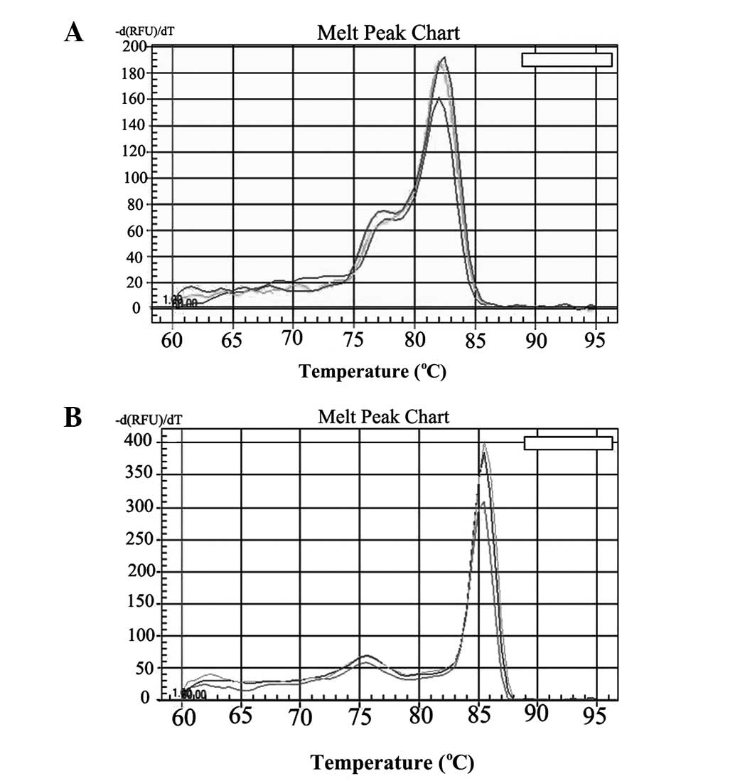 Real-time RT-PCR demonstrated that the sizes of the CD133 and GAPDH PCR product were 213 and 145 bp, respectively (Fig. 1). Dissociation curve analysis performed between 60–95°C demonstrated only the expected peaks at 82.1 and 85.1°C for CD133 and GAPDH, respectively (Fig. 2). The analysis demonstrated that each primer pair had sufficient specificity for use in the present study of CD133 expression. The mean ΔCt of CD133 expression was 10.98.