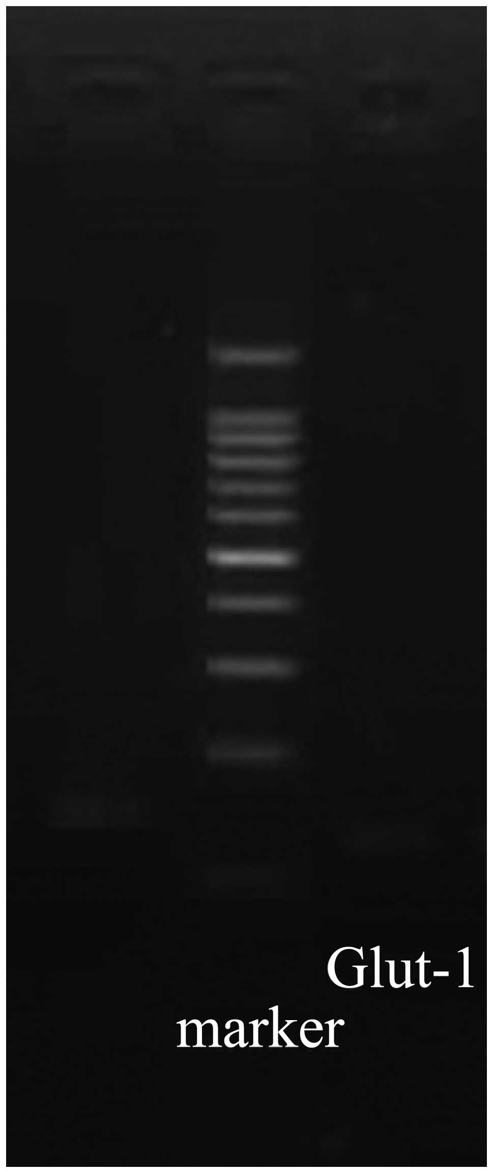 Western blotting was performed as described previously (26). The Glut-1 and β-tubulin (as a control) protein in each group of Hep-2 cells were assayed using a BAC protein quantitative kit (Wuhan Boster Biological Technology Co. Ltd., Wuhan, Hubei, China). Briefly, 80 μg of protein was subjected to 10% sodium dodecyl sulfate-polyacrylamide gel electrophoresis (SDS-PAGE) and transferred onto a nitrocellulose membrane (Millipore, Billerica, MA, USA). Skimmed milk (2%) was used as a blocking solution (room temperature, 1 h). The membrane was incubated with the primary antibody (Glut-1, 1:1,000; β-tubulin, 1:5,000) at room temperature for 3 h and with the secondary antibody (1:5,000, donkey anti-rabbit; 1:2,000, donkey anti-mouse) at room temperature for 1 h. The proteins were detected using an enhanced chemiluminescence system (Santa Cruz Biotechnology, Inc., Santa Cruz, CA, USA) and were exposed to X-ray film. Protein expression was analyzed semi-quantitatively using the Kodak Gel Logic Analysis System (Carestream Health Inc., Rochester, NY, USA).