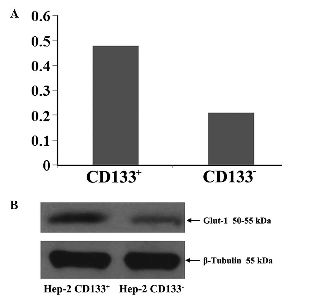 Mean Glut-1 protein levels in CD133+ Hep-2 cells and CD133− Hep-2 cells relative to β-tubulin were 0.48 ± 0.02 and 0.21 ± 0.03 μg/μl, respectively (P<0.05; Fig. 7).