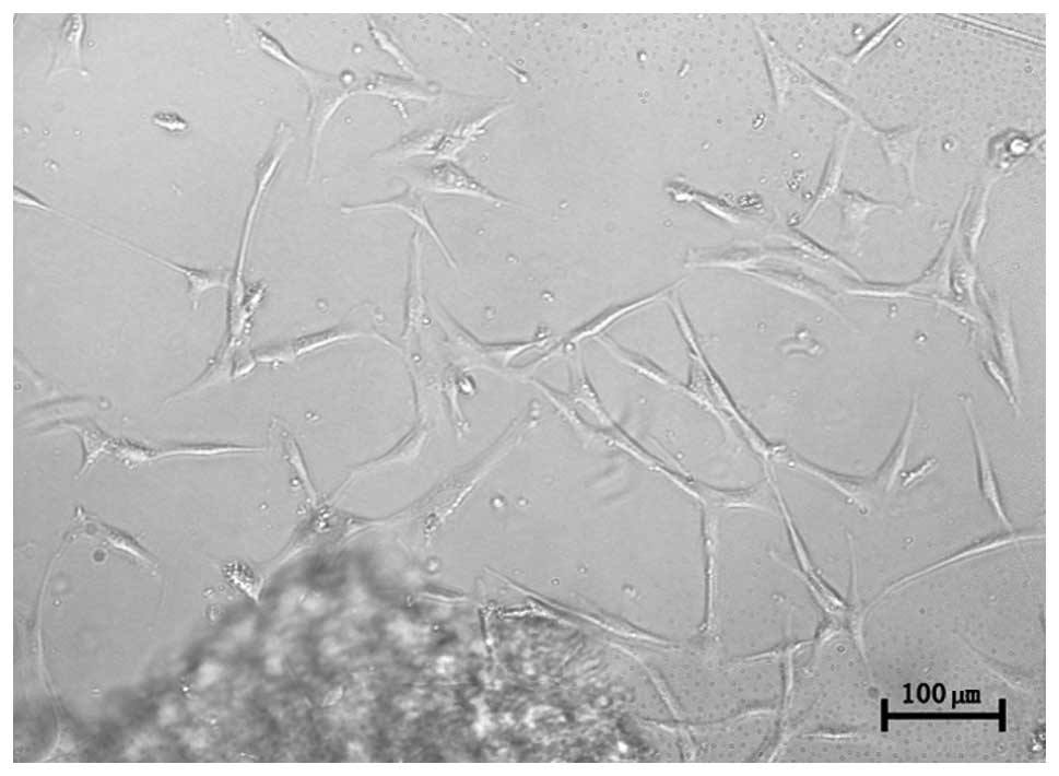 hUC-MSCs were observed following an initial three days of primary culture. The cells adhered to plastic surfaces and presented as a small population of single cells with spindle shape. After 7–10 days, the cells appeared as long spindle-shaped fibroblastic cells (Fig. 1). Following re-plating, the fibroblast-like cells appeared polygonal or spindly, with a long process and were considered normal, on the basis of typical morphology.