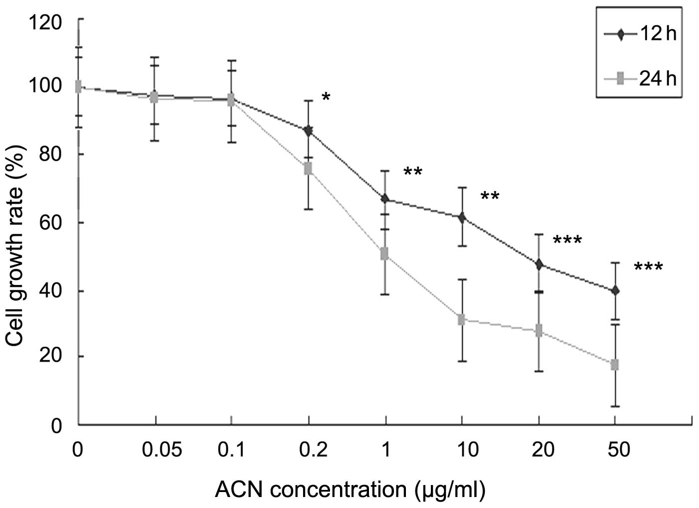 To investigate the cytotoxicity of ACN on hUC-MSC proliferation, cells were exposed to specific concentrations of ACN (0, 0.05, 0.1, 0.2,1, 10, 20 and 50 μg/ml) for 12 and 24 h. The MTT assay was used to determine ACN-induced toxicity in hUC-MSC. Following ACN treatment, the activation of hUC-MSC was markedly decreased in a dose- and time-dependent manner (Fig. 2), indicating that ACN is cytotoxic in hUC-MSC.
