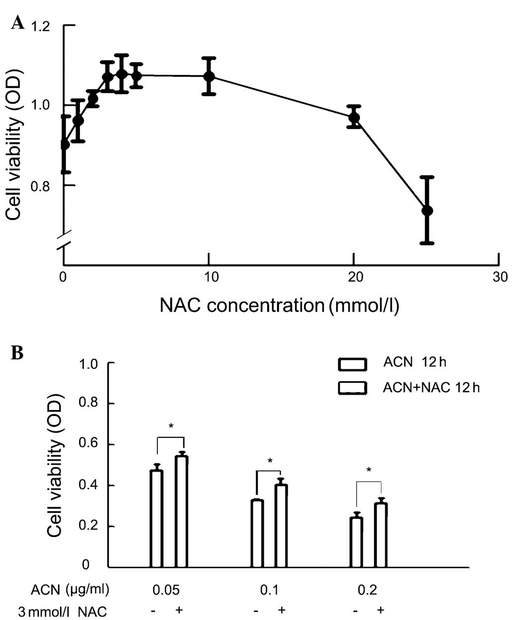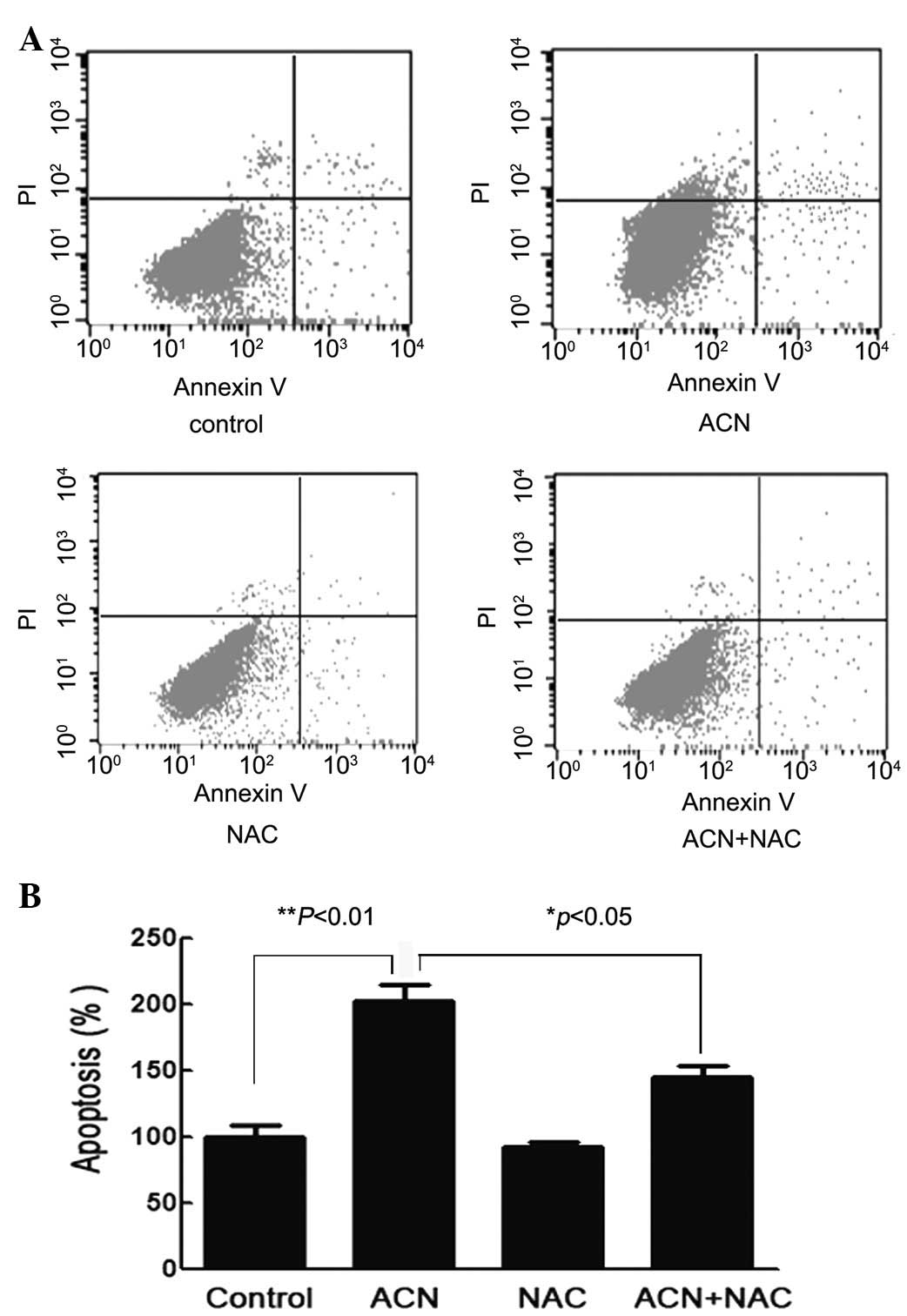 In addition, ACN inhibited cell proliferation with a smaller increase in apoptosis. A previous study demonstrated that ACN induces apoptosis (25) and further identified that the mechanism of ACN-induced cell death in hUC-MSCs is through induction of apoptosis involved in the generation of oxidative stress. ACN was observed to cause apoptosis in hUC-MSCs, as was observed by flow cytometry. A number of studies have been published stating that the antioxidant, NAC, protects the rat neurocyte from ACN toxicity, suggesting the involvement of oxidative stress in ACN toxicity. Using NAC as a potential protective agent may induce the apoptosis of hUC-MSCs. Oxidative stress is important in the initiation of apoptosis.