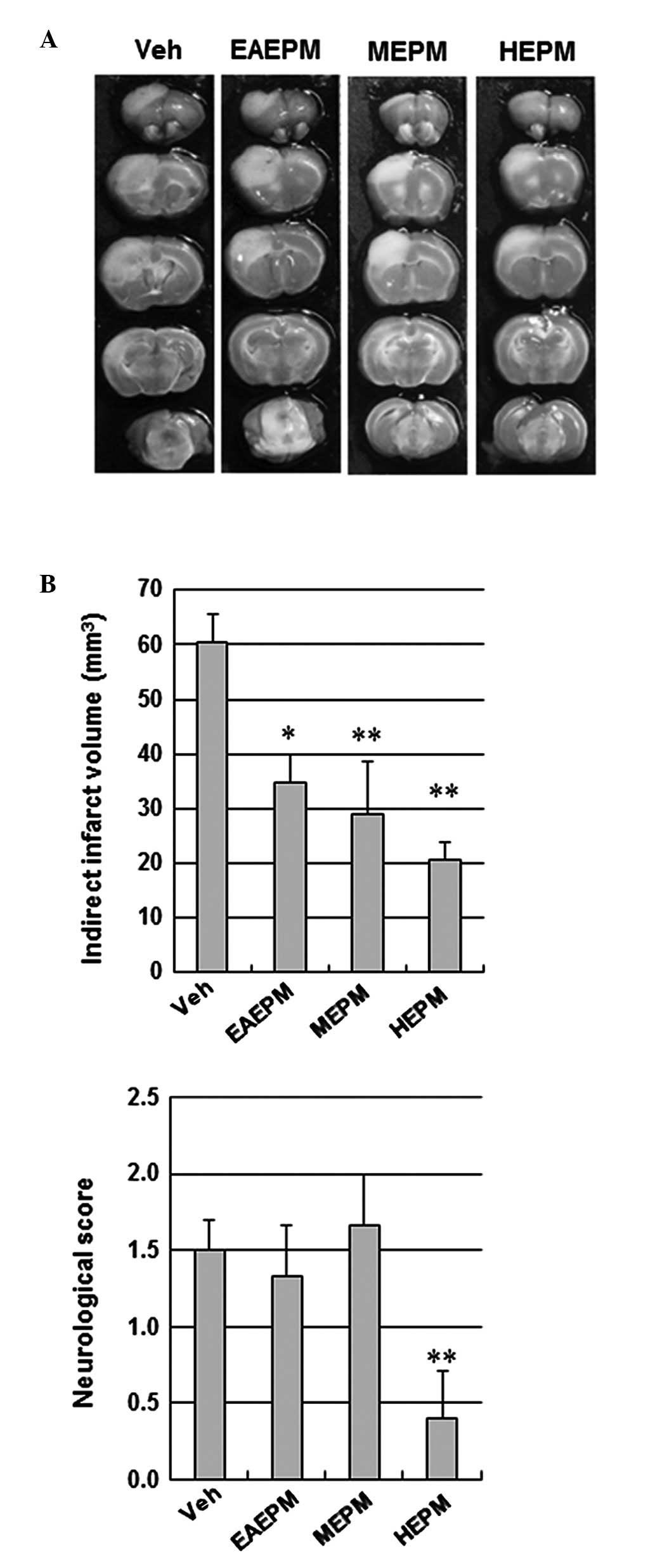 We investigated the protective effects of EAEPM, MEPM and HEPM using a focal cerebral ischemic mouse model. EAEPM, MEPM and HEPM (100 mg/kg, intraperitoneally) were separately administered to the mice 30 min prior to ischemic insults. As summarized in Fig. 1, EAEPM, MEPM and HEPM all significantly decreased the cerebral infarct volume (34.9±4.9 mm3, 28.9±9.8 mm3 and 20.5±2.3 mm3, respectively) relative to the vehicle (Veh) treatment (60.6±5.1 mm3). Among these, HEPM exhibited the greatest protective effects against ischemic brain injury. Furthermore, only HEPM significantly improved neurological deficits. Therefore, HEPM was selected for further study.