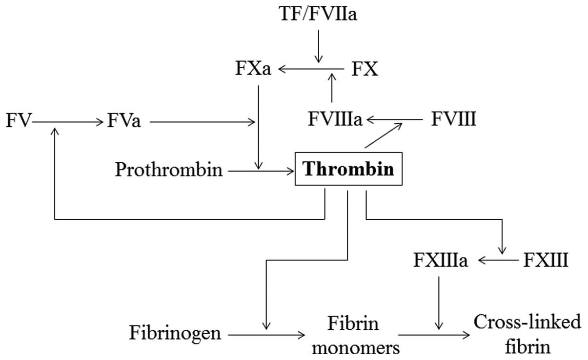Thrombin plays a central role in blood coagulation. It is a Na+-activated (2), trypsin-like serine protease, activated from a larger precursor protein (pro-thrombin). The active form of thrombin (α-thrombin) consists of a 36-amino acid light chain (A chain) and a 259-amino acid peptidase domain (B chain) covalently linked by a disulfide bridge (3). The active site of thrombin has three pockets: S1, S2 and S3. Pocket S1 contains an aspartic acid residue (Asp-189) at its bottom, which serves as the recognition site for the basic side chain. Pocket S2 occludes a hydrophobic pocket in the proximity of the Trp-60D residue; this pocket can accept larger aliphatic residues, such as valine and proline. Pocket S3 is flat and exposed to the solvent. Besides the active site, thrombin has two important regulatory regions, exosites 1 and 2. Exosite 1 was shown to be involved in the binding to fibrinogen, factor V, VIII, thrombomodulin and platelet protease-activated receptors (PARs), and exosite 2 was shown to be involved in the binding to factor V, VIII, platelet glycoprotein Ibα (GPIbα) and heparin (4). Thrombin plays a central role in maintaining the integrity of hemostasis. It interacts with most of the zymogens and their cofactors, and plays both pro- and anticoagulant roles in the blood (Fig. 1). Thrombin activates platelets, leading to platelet aggregation. It converts fibrinogen into fibrin monomers, which spontaneously polymerize into fibrin polymers and activate factor XIII, a protein involved in fibrin cross-linking and clot stabilization. Thrombin also activates factor V and VIII in a positive feedback reaction (5).