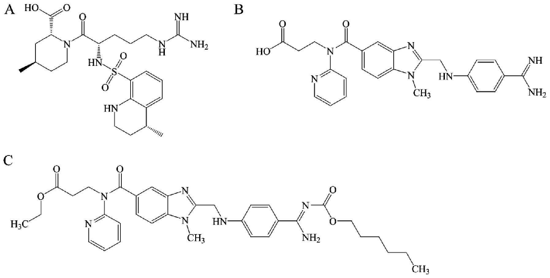 Dabigatran (Fig. 2B) is a synthetic benzamidine-derived direct thrombin inhibitor that rapidly and directly inhibits both free and fibrin-bound thrombin (7). It also exerts an inhibitory effect on thrombin-induced platelet aggregation and prevents the conversion of fibrinogen to fibrin. Dabigatran is metabolized by the glycoprotein system and eliminated through the kidneys (12). However, the absolute bioavailability of dabigatran after oral absorption is very low (6–7%) (13). Dabigatran was the first anticoagulant approved by the FDA for primary prevention of ischemic stroke and systemic thromboembolism in patients without valvular atrial fibrillation (7).