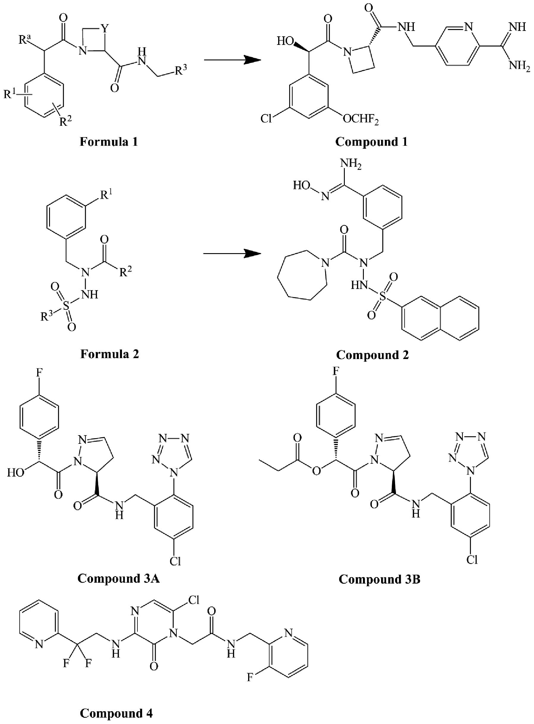 Typically, DTIs possess a P1 group that fills the specific S1 pocket. Generally, to produce potent inhibitors, the P1 ligand features a strongly basic functional group such as guanidine (argatroban), alkylamine, amidine, benzamidine (dabigatran), or 4-aminopyridine (26). Patents WO00/42059 (27), US2007/0249578 A1 (28) and US2010/0087651 Al (29) disclosed a series of compounds in which the P1 position was replaced with amidino, benzamidine, or their analogs. For example, compound 1 (Fig. 3), derived from formula 1 (Fig. 3), has an IC50 of prothrombin time (PT) <0.02 μM, and an IC50 of activated partial thromboplastin time (APTT) <1 μM. Compounds containing strongly basic amines in the P1 position have poor oral absorption properties and poor pharmacokinetics, because the basic amines are protonated at the pH of the intestinal tract.