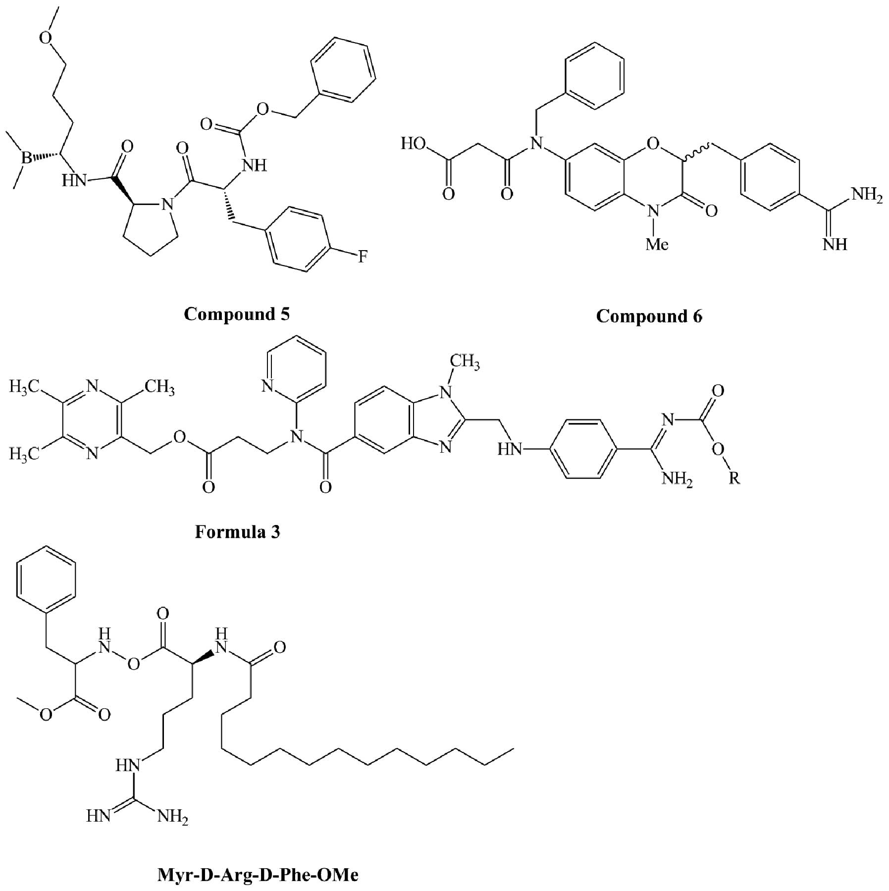 Strategies to overcome these shortcomings include the use of a prodrug with a masked, weakly basic or non-basic, P1 group, such as dabigatran etexilate (30). N-hydroxylated derivatives such as amidoxime and benzamidoxime, are less basic because of the introduced oxygen atom. They are not protonated under physiological conditions and are expected to have sufficient oral absorption, and therefore, improved bioavailability (31). Patent US2008/0004256 A1 (32) disclosed a series of compounds derived from formula 2 (Fig. 3). Compound 2 (Fig. 3), where the P1 position is replaced by benzamidoxime, is the most bioavailable of these compounds. The inhibition constant (Ki) values for thrombin and trypsin are 0.59 and 32.23 μM, respectively, for this compound. Azoles (26,33) (such as imidazoles, aminothiazoles and N-acetamidoimidazole) and aryl heterocycles (pyridines, pyrazinones, piperidines and pyridinones) are also weakly basic groups. When they are incorporated into the P1 position, the resulting peptides exhibit very good selectivity for thrombin vs. trypsin and lower in vivo toxicity.