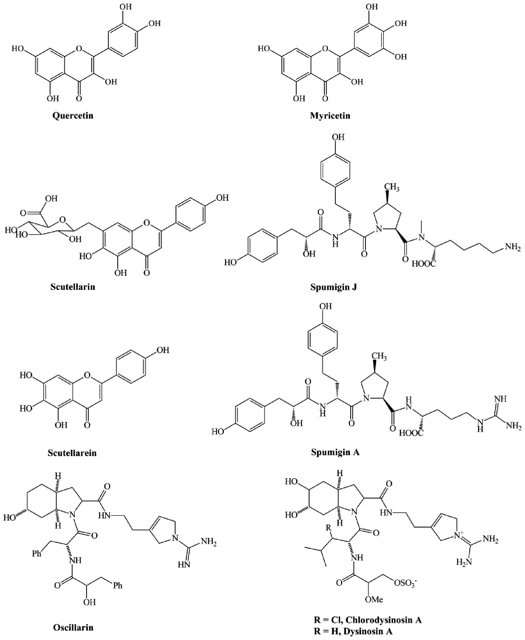 Natural flavonoids such as myricetin and quercetin (Fig. 5) were discovered to act as thrombin inhibitors, but with low activity. The IC50 of TT is 0.006 and 0.035 mM for myricetin and quercetin, respectively (74). Glycerolipids, especially the diacylglycerophospholipids isolated from the fungus Stereum hirsutum, can inhibit thrombin by binding to its active site (75). Scutellarin (Fig. 5), the major anti-oxidant in breviscapine extracted from the plant species Erigeron breviscapus, was clinically effective in treating acute cerebral infarction and paralysis induced by cerebrovascular diseases. However, it has certain disadvantages, such as low solubility in water and low bioavailability. Scutellarein (Fig. 5), the hydrolyzed product and metabolic form of scutellarin, was used to design and synthesize derivatives with improved biological activity and water solubility. Many of these derivatives, especially the morpholinyl aminomethylene substituent, showed stronger anticoagulant activity and higher solubility in water (76). A recent study identified thrombin inhibitors isolated from the freshwater cyanobacterium Anabaena compacta. These molecules, known as spumigin J and A (Fig. 5), inhibited thrombin with EC50 values of 4.9 and 2.1 μM, respectively. In addition, the two compounds showed higher inhibitory activity against cathepsin B, with EC50 values of 0.7 and 0.2 μM, respectively (77). Chlorodysinosin A, dysinosin A and oscillarin (Fig. 5), three natural products that belong to the aeruginosin family of serine protease inhibitors, exhibit low inhibitory activity against thrombin in vitro (IC50=5.8, 46 and 28 nM, respectively). These molecules inhibit thrombin owing to their hydrophobic interactions with the S3 site of thrombin (78).