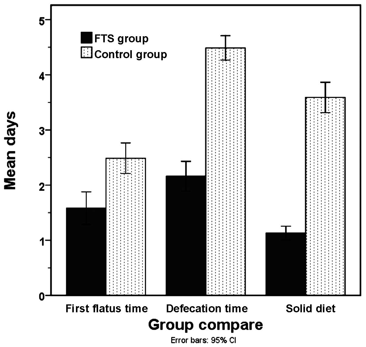 The average length of total hospital stay for the FTS and control groups was 5.9±0.8 and 10.9±1.3 days, respectively (P<0.05), and the length of post-operative hospital stay was 4.3±0.8 and 8.0±1.1 days, respectively (P<0.05). First flatus time for the FTS and control groups was 1.6±0.8 and 2.5±0.9 days, respectively (P<0.05), while defecation time was 2.2±0.7 and 4.5±0.7 days, respectively (P<0.05). The time to restoration of a solid diet also exhibited a significant difference between the FTS and control groups (1.1±0.3 vs. 3.6±0.9 days; P<0.05) (Fig. 1).