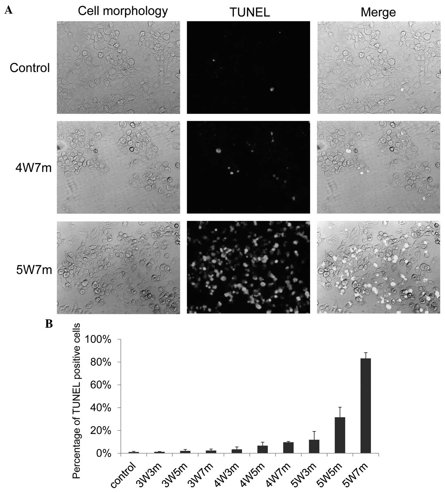 A 915-nm laser (Brother Industries) was used to automatically irradiate cells in 96-well plates for different durations and at varying powers. The KP4 pancreatic cancer cell line was used to examine whether irradiation with a 915-nm laser exerted an effect on cancer cells. The KP4 cells were irradiated for different durations and at different powers, and then 24 h later, the cells were subjected to the TUNEL assay to assess apoptosis (Fig. 1A). A limited number of apoptotic cells were observed following irradiation with a 3-Watt (W) laser; however, apoptotic cells were observed following an increase in the power of the laser and the duration of treatment. Almost 10% and 30% of the cells became apoptotic 24 h following irradiation with a 4 W laser for 7 min and a 5 W for 5 min, respectively (Fig. 1B). Apoptosis was induced in almost 90% of KP4 cells following irradiation with a 5 W laser for 7 min (Fig. 1B).