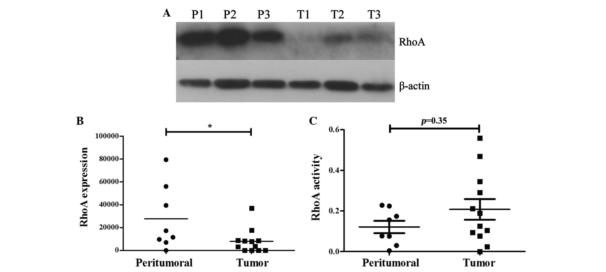 To the best of our knowledge, the present study is the first to evaluate RhoA expression not only in the centre of tumours, but also at the tumour front and in peritumoural tissues. The current study identified significantly increased RhoA expression at the tumour front compared with the tumour centre.