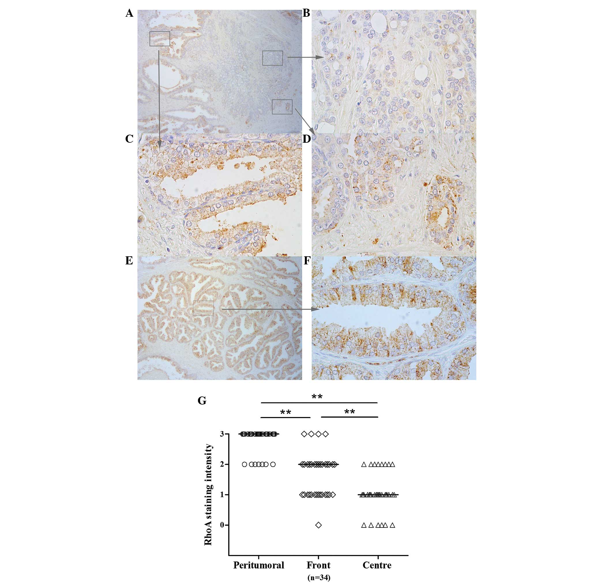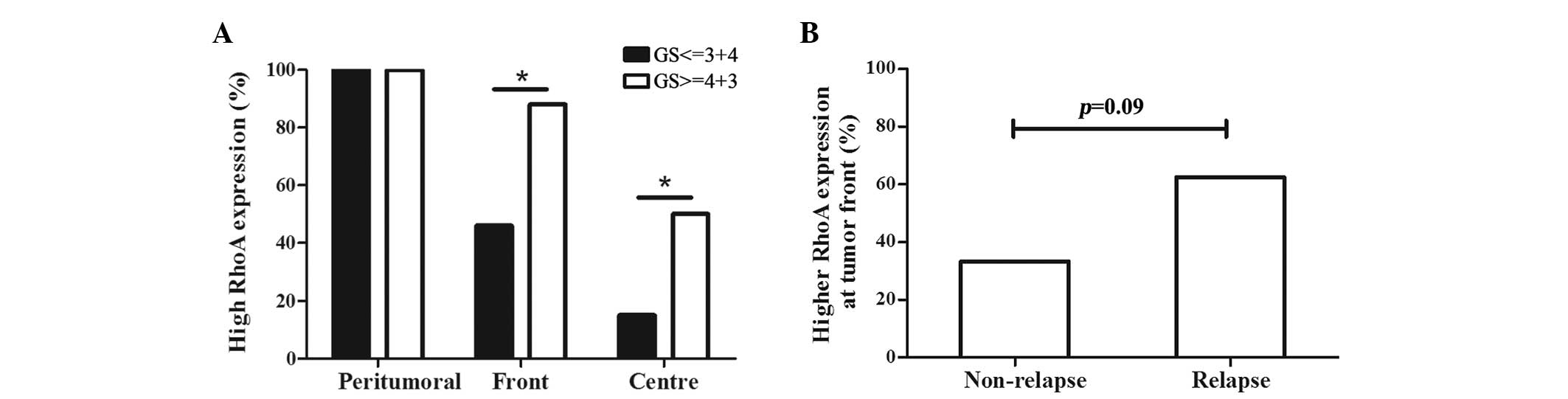 In conclusion, the present study has identified increased RhoA expression in prostate tumour fronts and has determined associations between increased RhoA expression and cancer relapse, increased RhoA expression and increased Gleason score. This indicates an association between RhoA expression and aggressiveness of the prostate cancer. The present findings may provide a foundation for novel therapeutic approaches that may inhibit the clinical aggressiveness of prostate cancer.