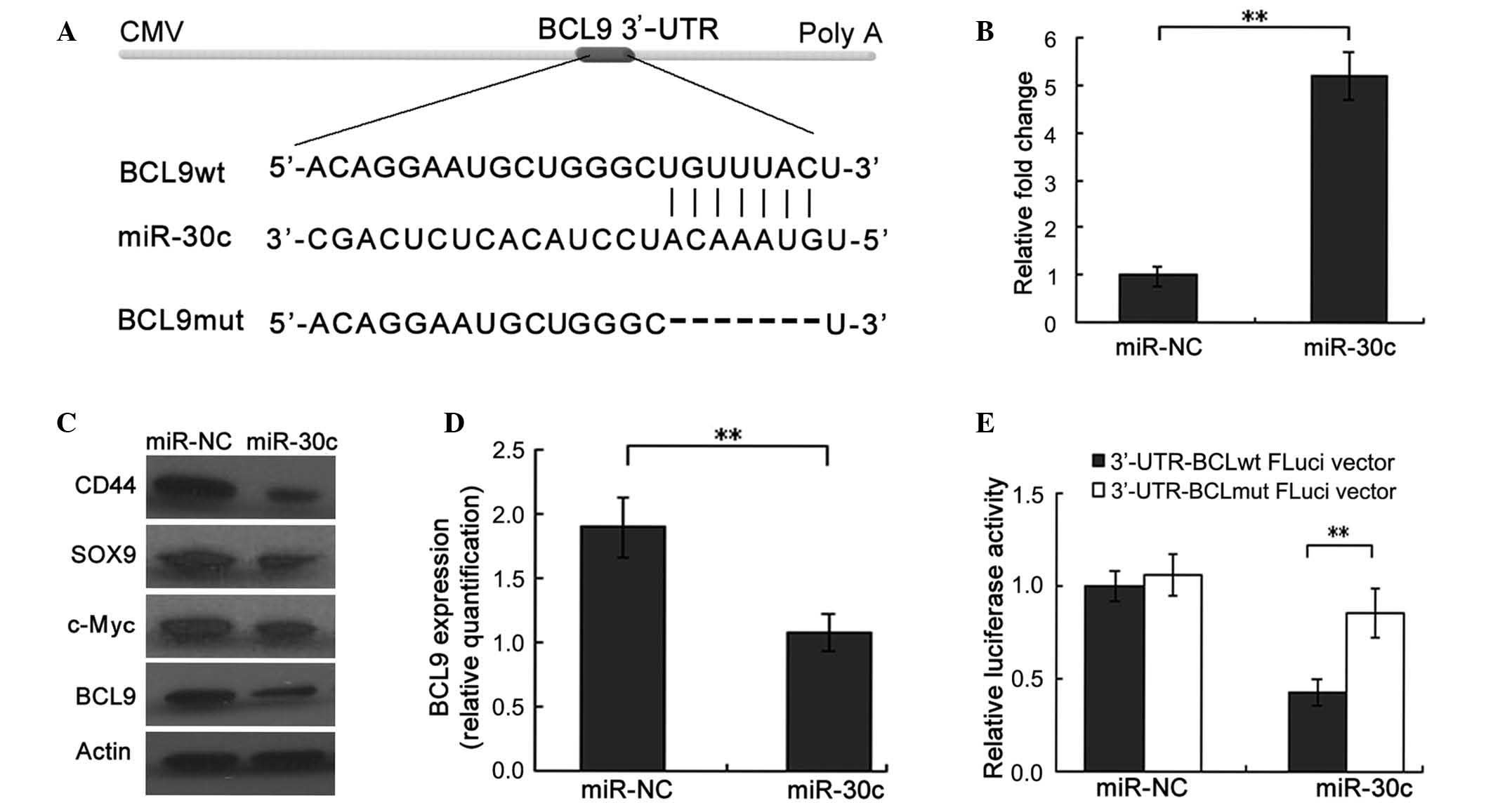 The present study aimed to investigate the effects of miR-30c overexpression on BCL9 in PCa cells, and whether BCL9 is a direct target of miR-30c. In addition, the effects of ectopic expression of miR-30c on the expression of Wnt pathway downstream targets, including c-Myc, CD44 and SOX9 were explored. Furthermore, the association between BCL9 expression and various clinicopathological factors, including Gleason score and BCR, were assessed. The findings indicate that there is a functional link between miR-30c and BCL9 in PCa, and that the small molecule miR-30c may serve as a potential therapy by inhibiting the BCL9/β-catenin interaction and selectively suppressing oncogenic Wnt transcription.