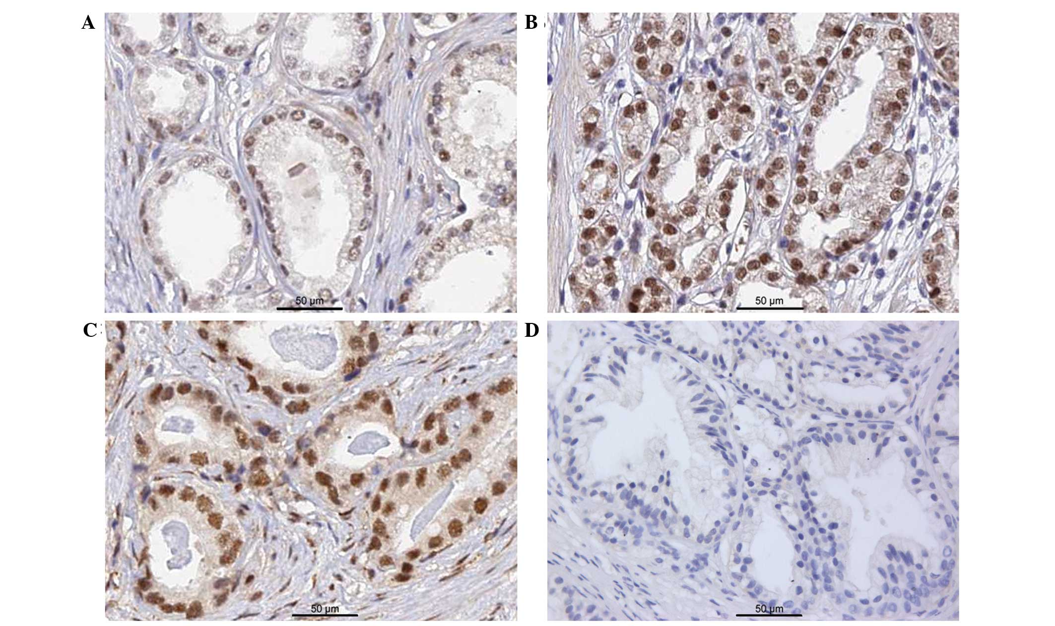 Immunohistochemical analyses were conducted on tissue samples from a cohort comprising 98 PCa and 20 BPH cases, using an antibody specific for BCL9. Staining was predominantly distributed in the nuclei of PCa cells (Fig. 2A–C). In some sections of BPH tissues, very faint BCL9 staining was observed when compared to PCa tissues, and was considered in the negative range (Fig. 2D). The positive expression rate of BCL9 in the tissues from PCa patients (52/98; 53.1%) was significantly higher than that in normal prostate tissues (5/20; 25.0%) (P=0.022).