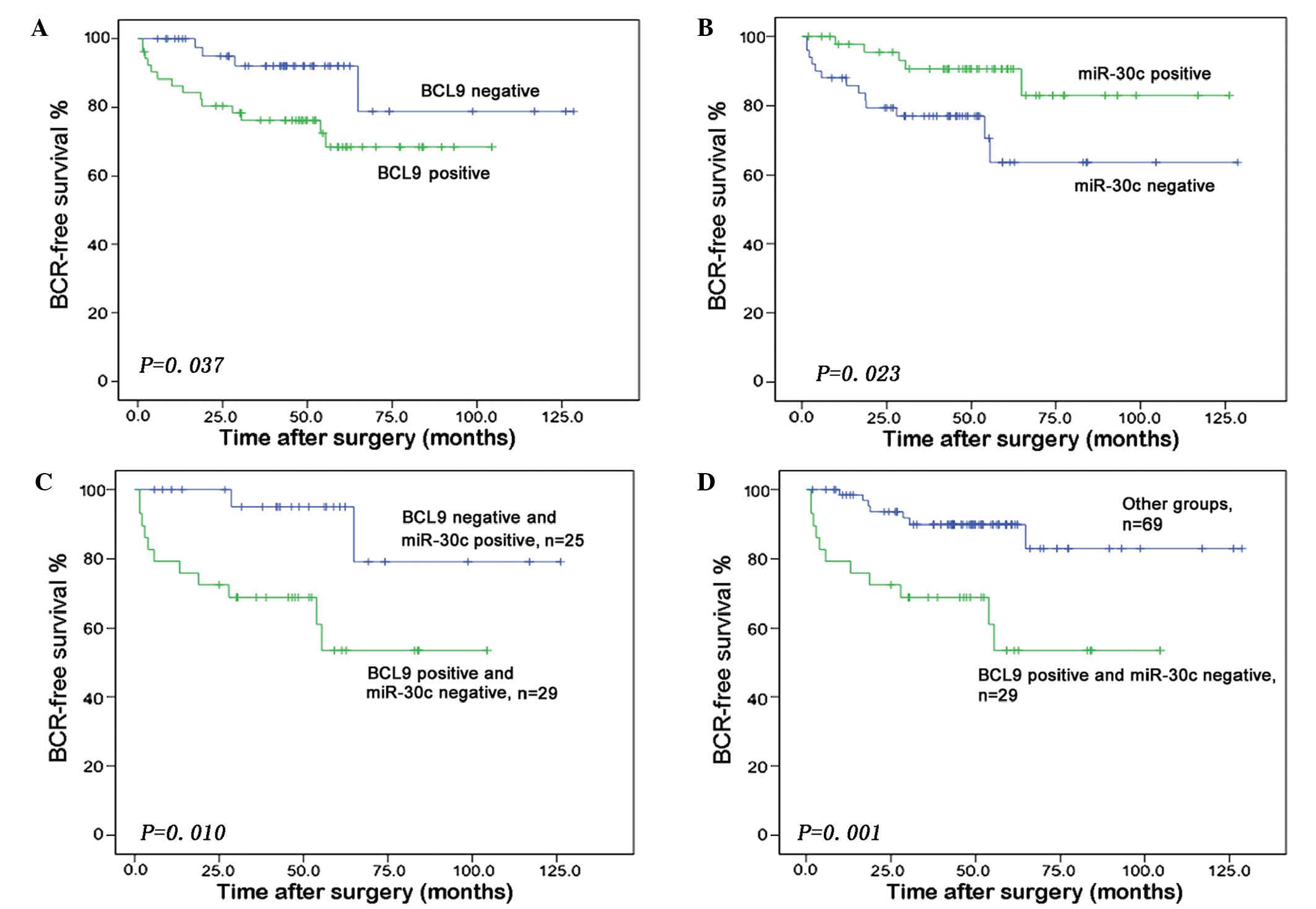 All statistical analyses were performed using SPSS version 17.0 for Windows (SPSS, Inc., Chicago, IL, USA). Continuous variables were compared using a Students t-test. The associations between miR-30c and BCL9 expression were assessed by Spearman's rank correlation coefficient. Associations between BCL9 and clinicopathological variables were evaluated by Fisher's exact or Pearsons χ2 tests. Kaplan-Meier survival curves were generated to evaluate the effect of miR-30c and BCL9 expression levels on survival rate. A Cox proportional hazards regression model was used to establish independent factors associated with BCR. P<0.05 was considered to indicate a statistically significant difference.