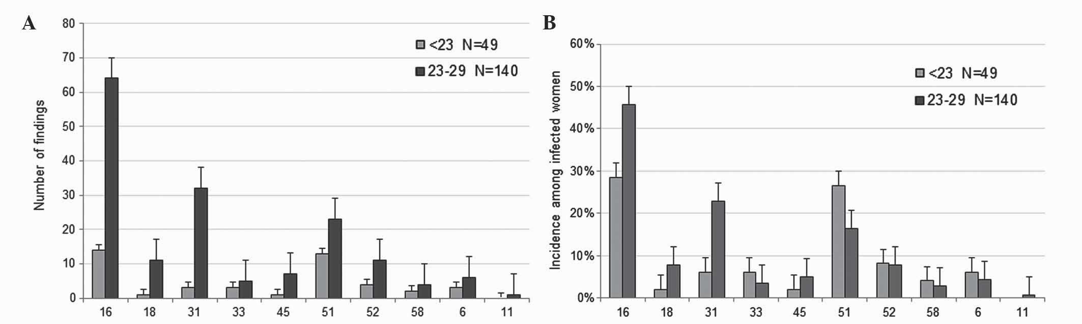 In addition, the present study observed that the prevalence of HPV16 and 18 in participants >30 years old was 33.81%, which is close to the prevalence of 34.50% identified in a previous study (36). In participants aged <30 years old, the highest incidence of HPV16 and 18 was 47.62%, which is higher than the prevalence of 37.40% identified in a previous study on young women <30 years of age in Germany (37). The decreasing prevalence of HPV16 in older participants demonstrated by the current study has previously been described in a cross-national study conducted prior to the initiation of the HPV vaccination program (11).